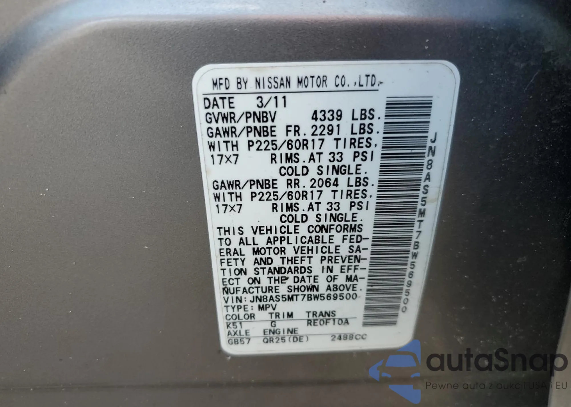 • VIN JN8AS5MT7BW569500