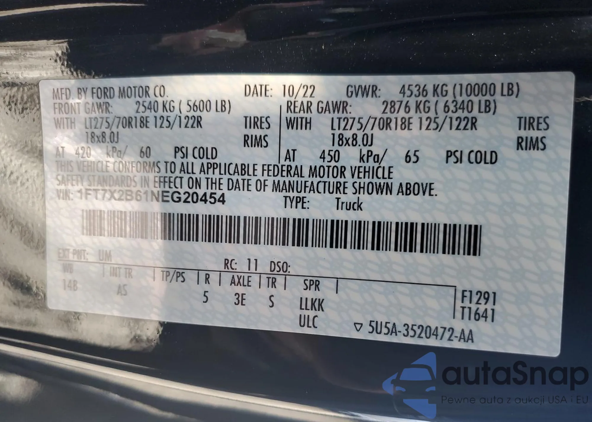 • VIN 1FT7X2B61NEG20454