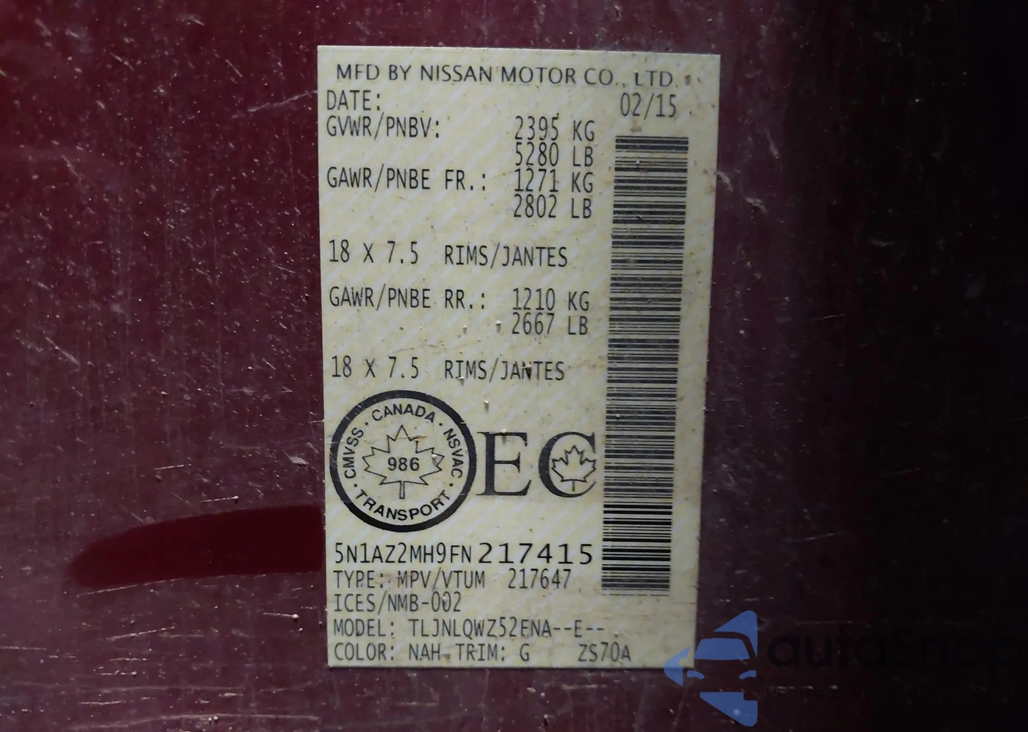 • VIN 5N1AZ2MH9FN217415