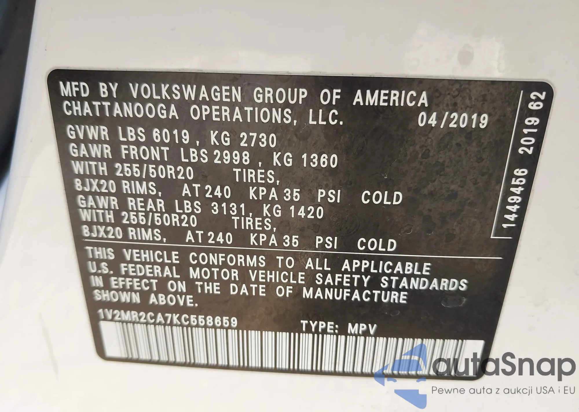 LOT: 43650483 VIN: 1V2MR2CA7KC558659