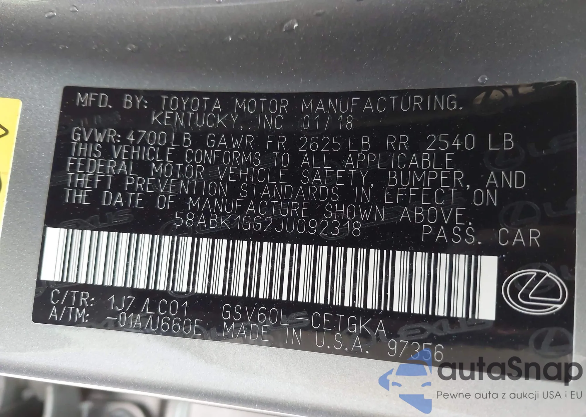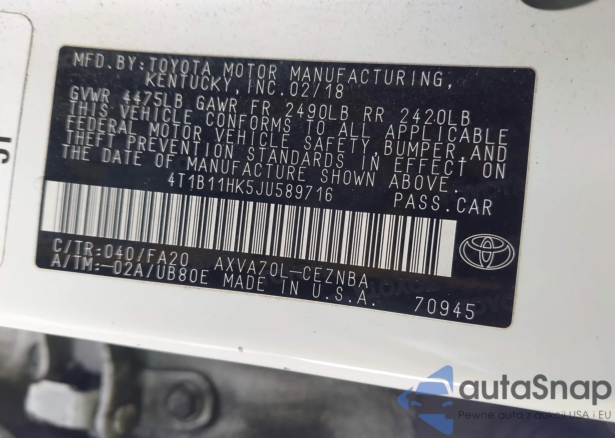 LOT: 43691024 VIN: 4T1B11HK5JU589716