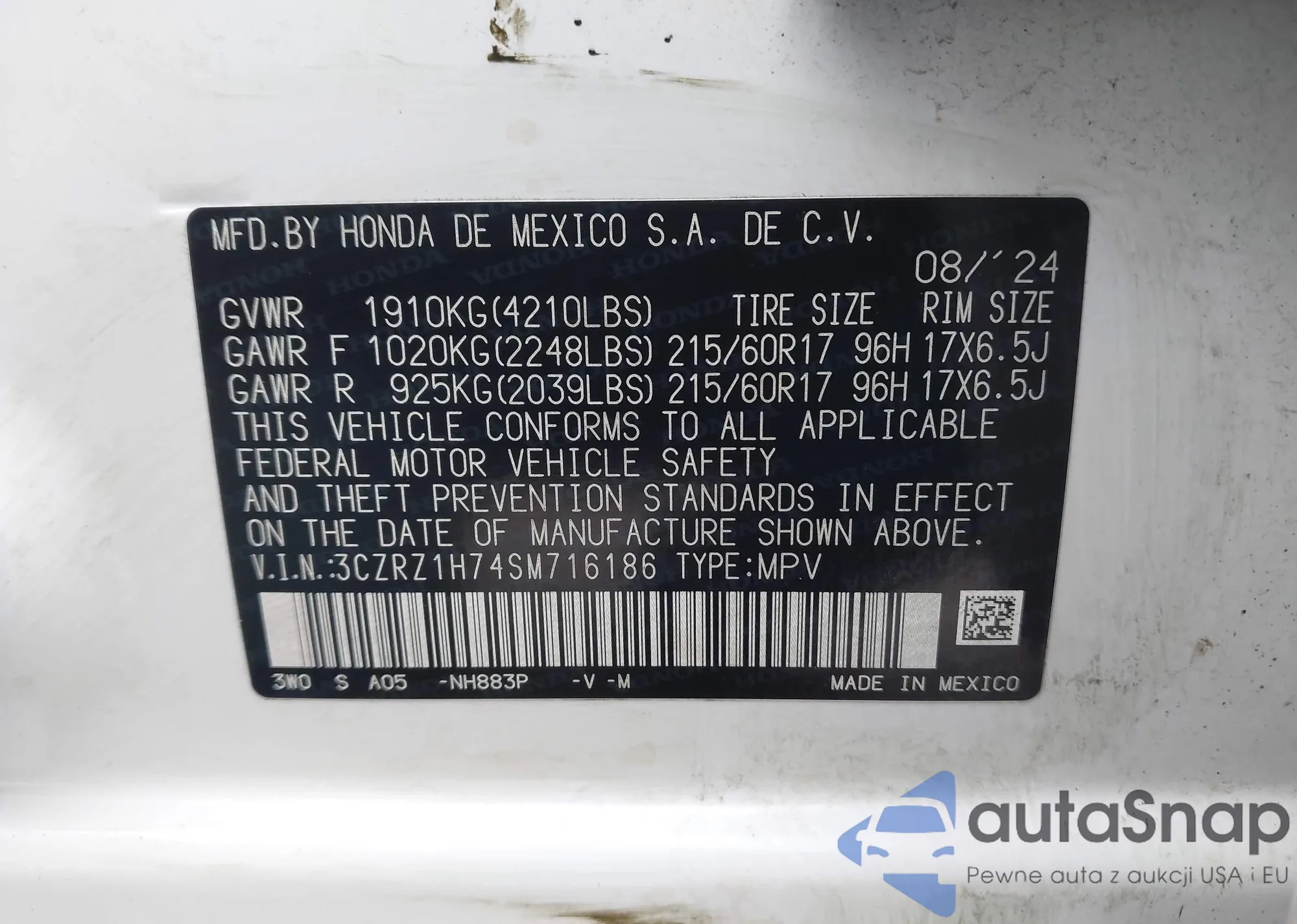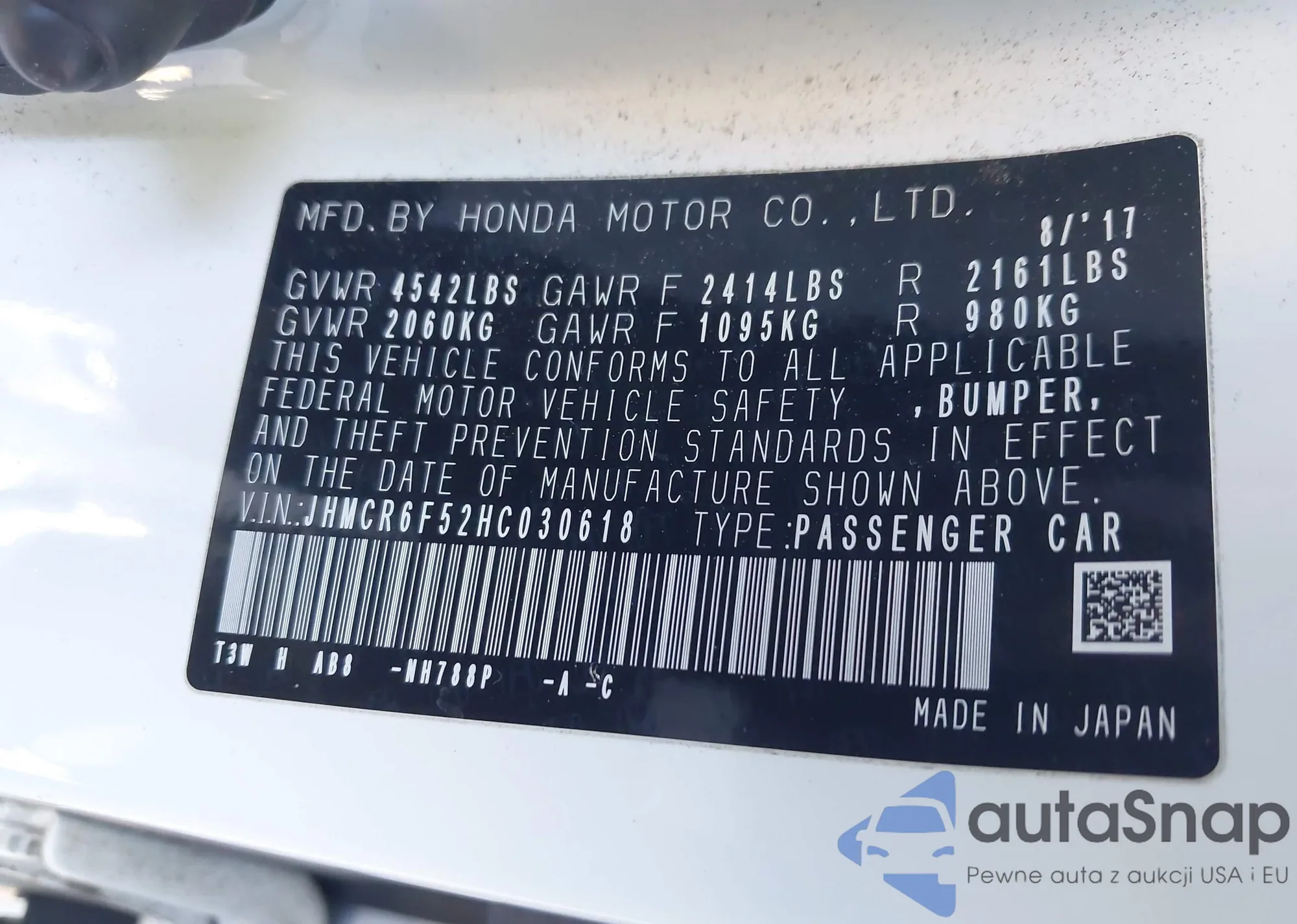 • VIN JHMCR6F52HC030618