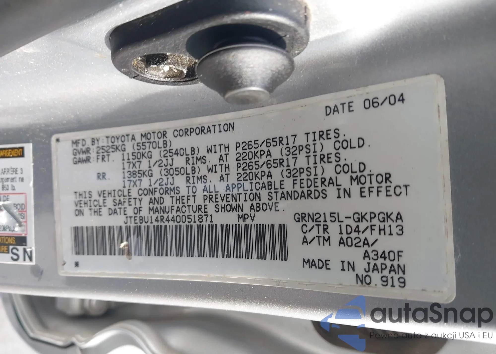 LOT: 43958870 VIN: JTHBN36F565033190