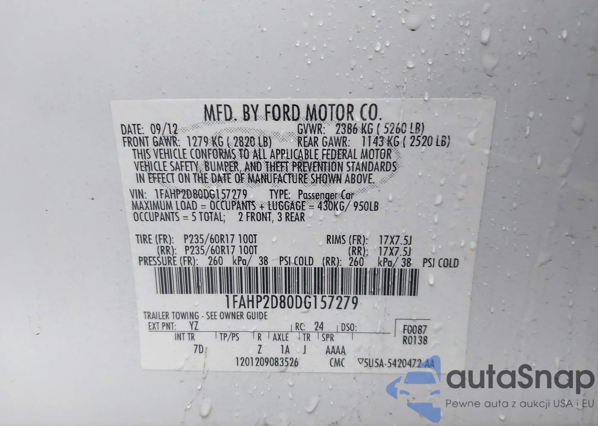 LOT: 44060757 VIN: 1FAHP2D80DG157279