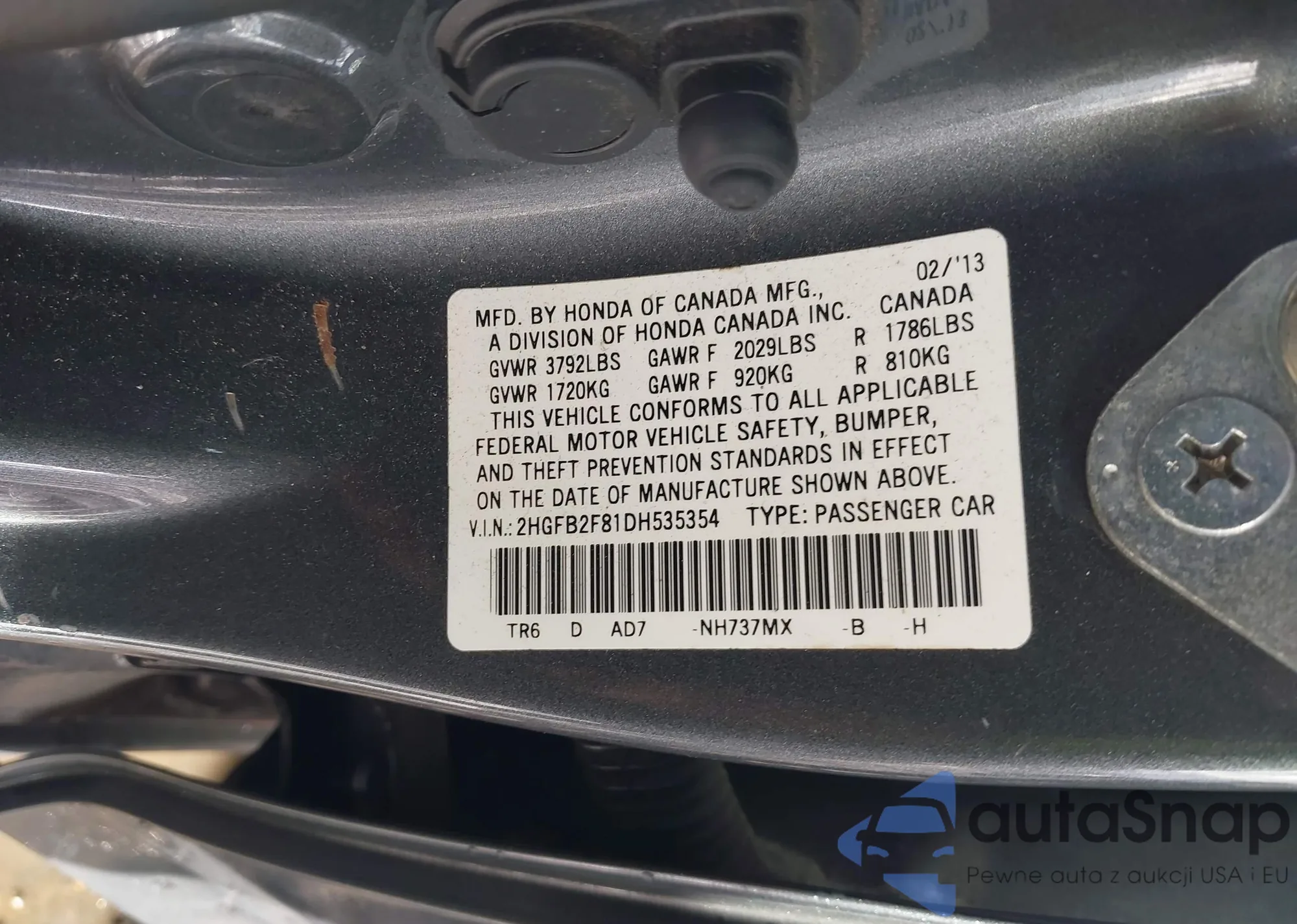 LOT: 43945875 VIN: 2HGFB2F81DH535354