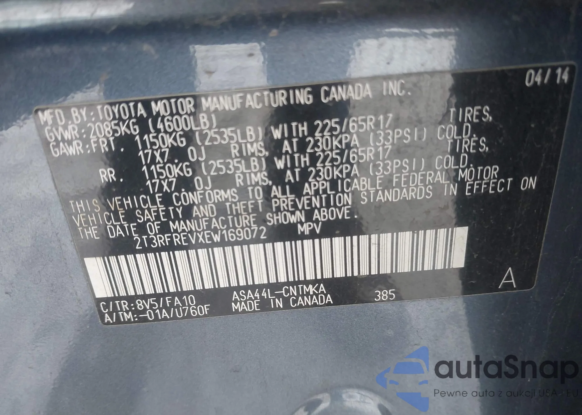LOT: 43915088 VIN: 2T3RFREVXEW169072