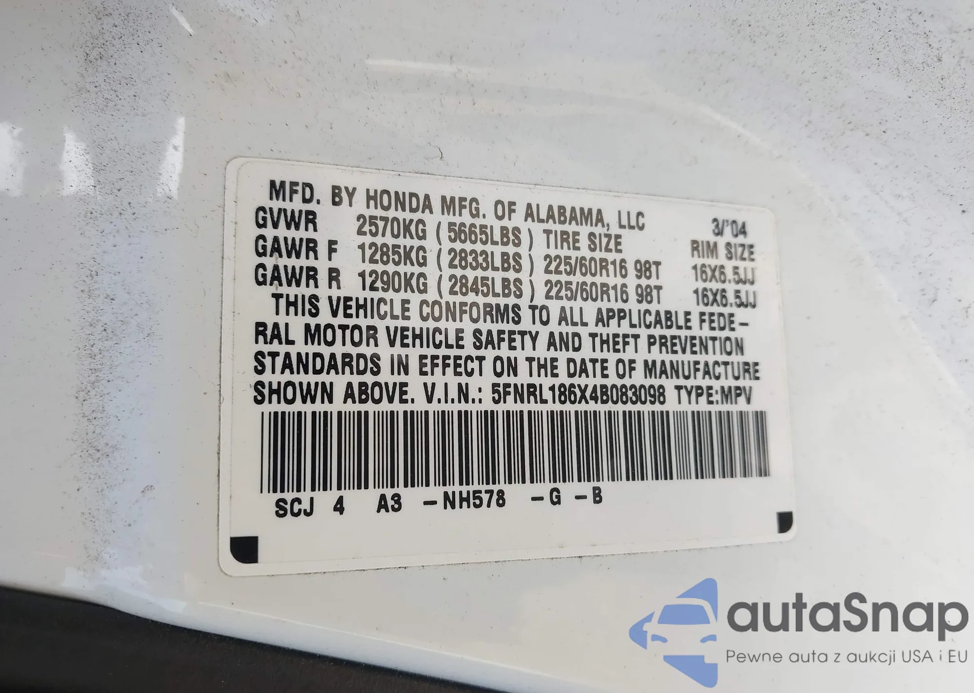 • VIN 5FNRL186X4B083098