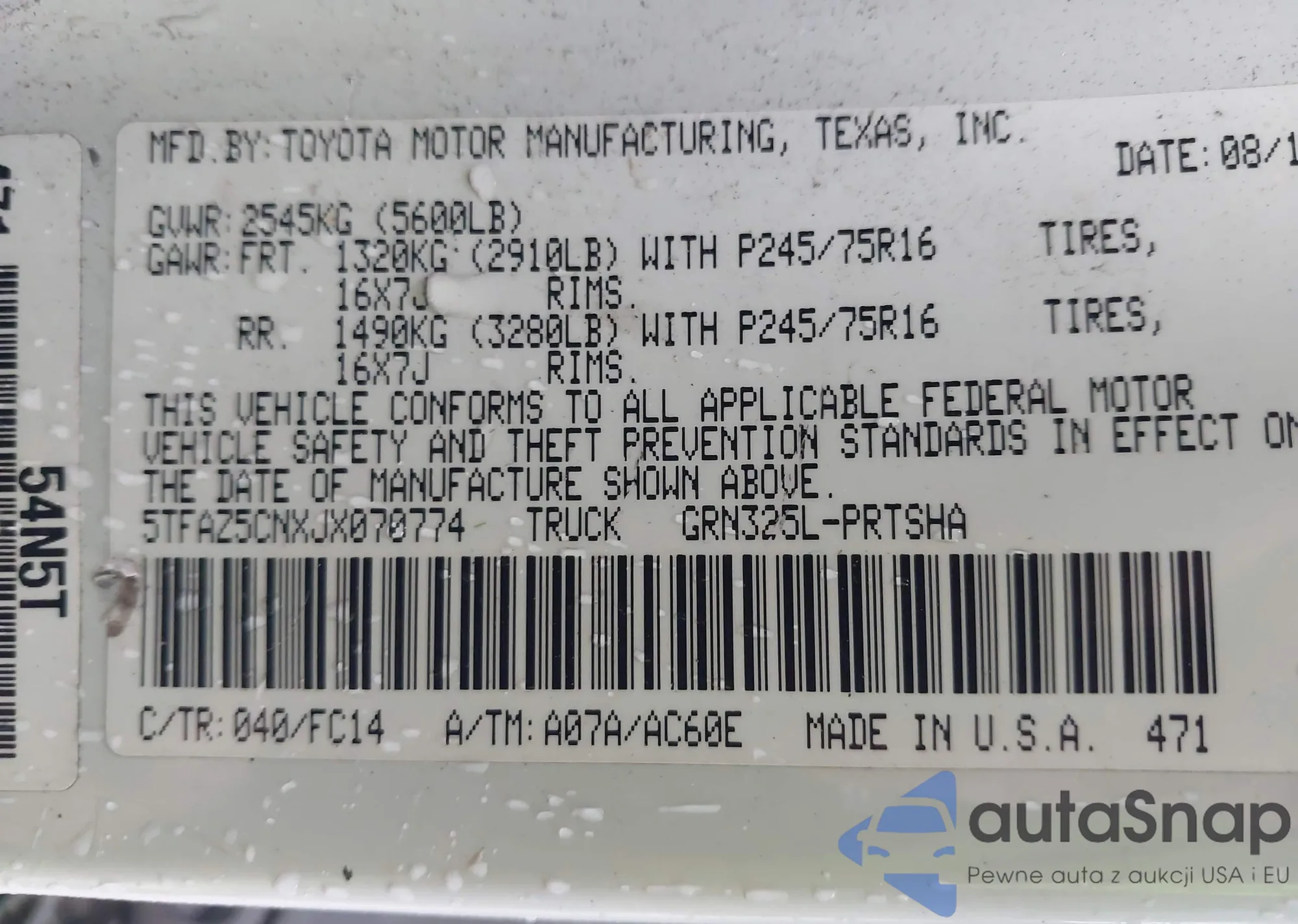 • VIN 5TFAZ5CNXJX070774
