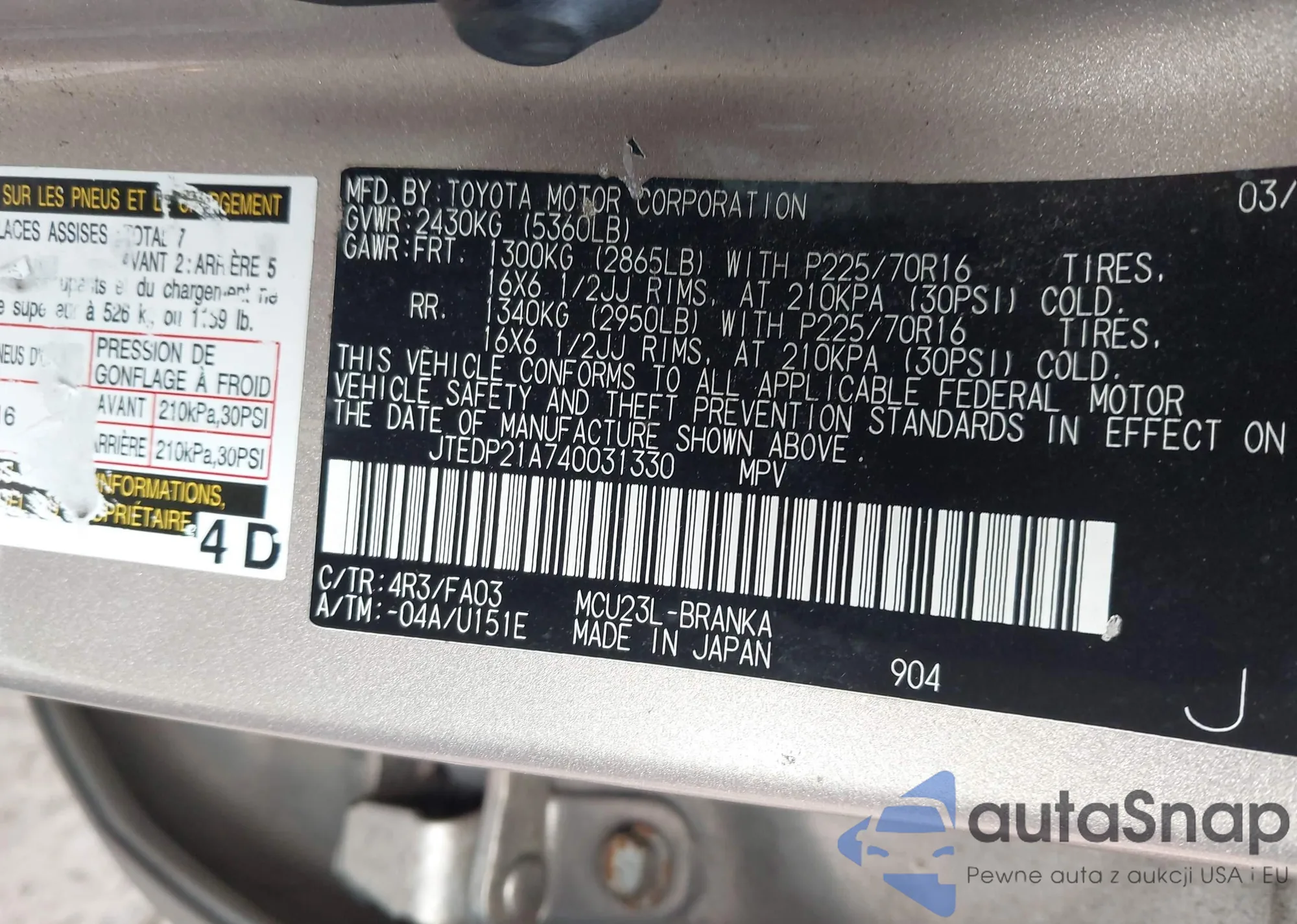 • VIN JTEDP21A740031330