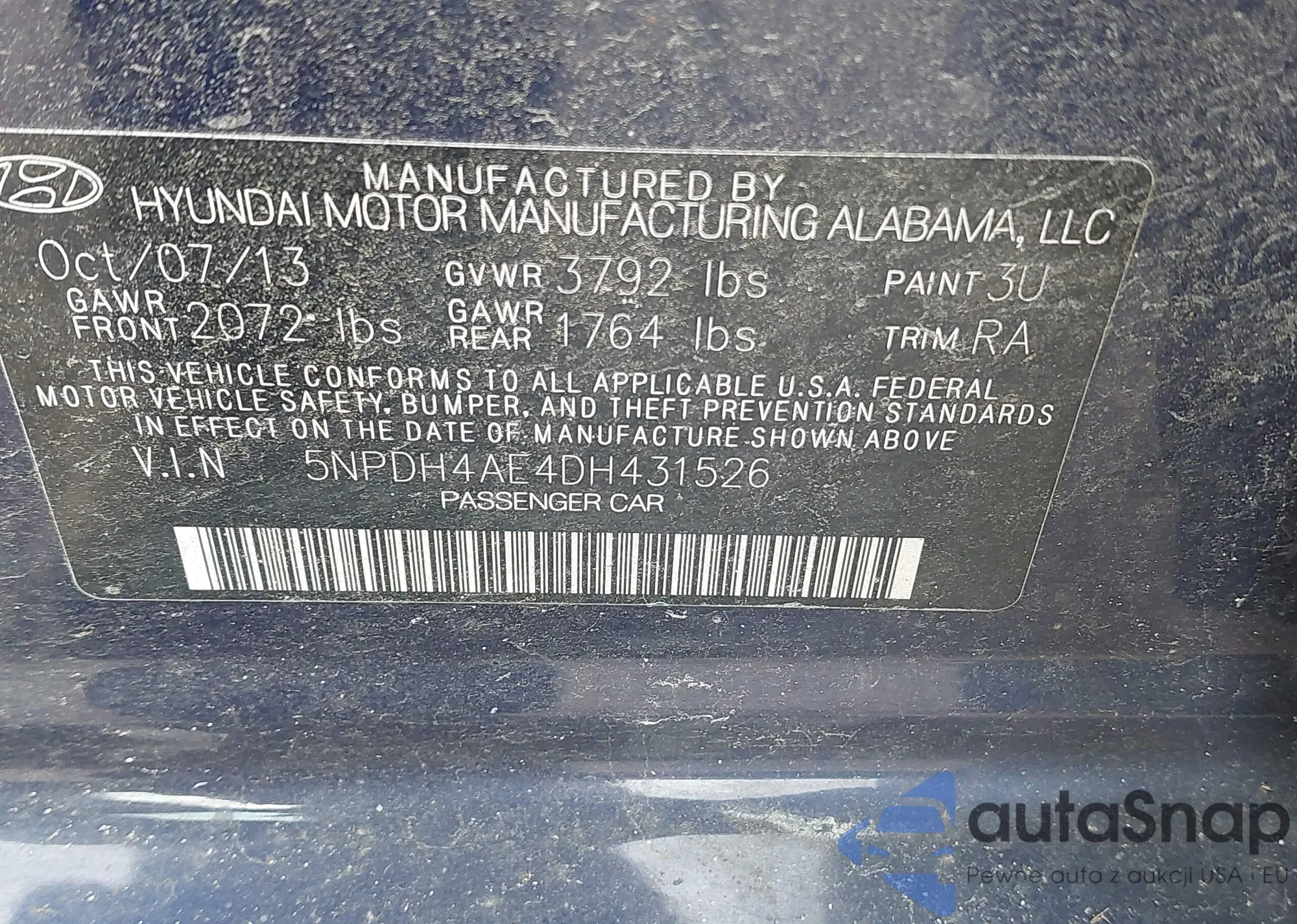 • VIN 5NPDH4AE4DH431526