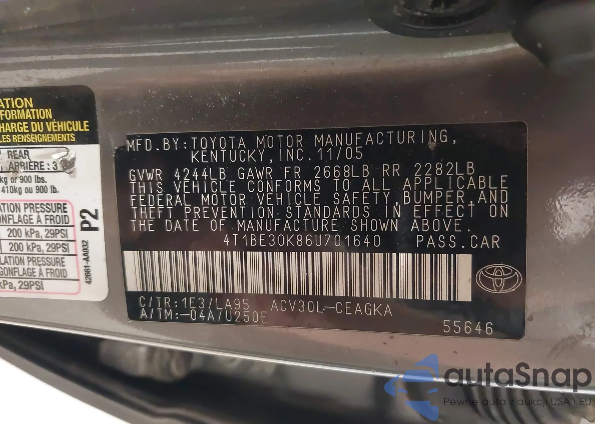 LOT: 43854481 VIN: 4T1BE30K86U701640