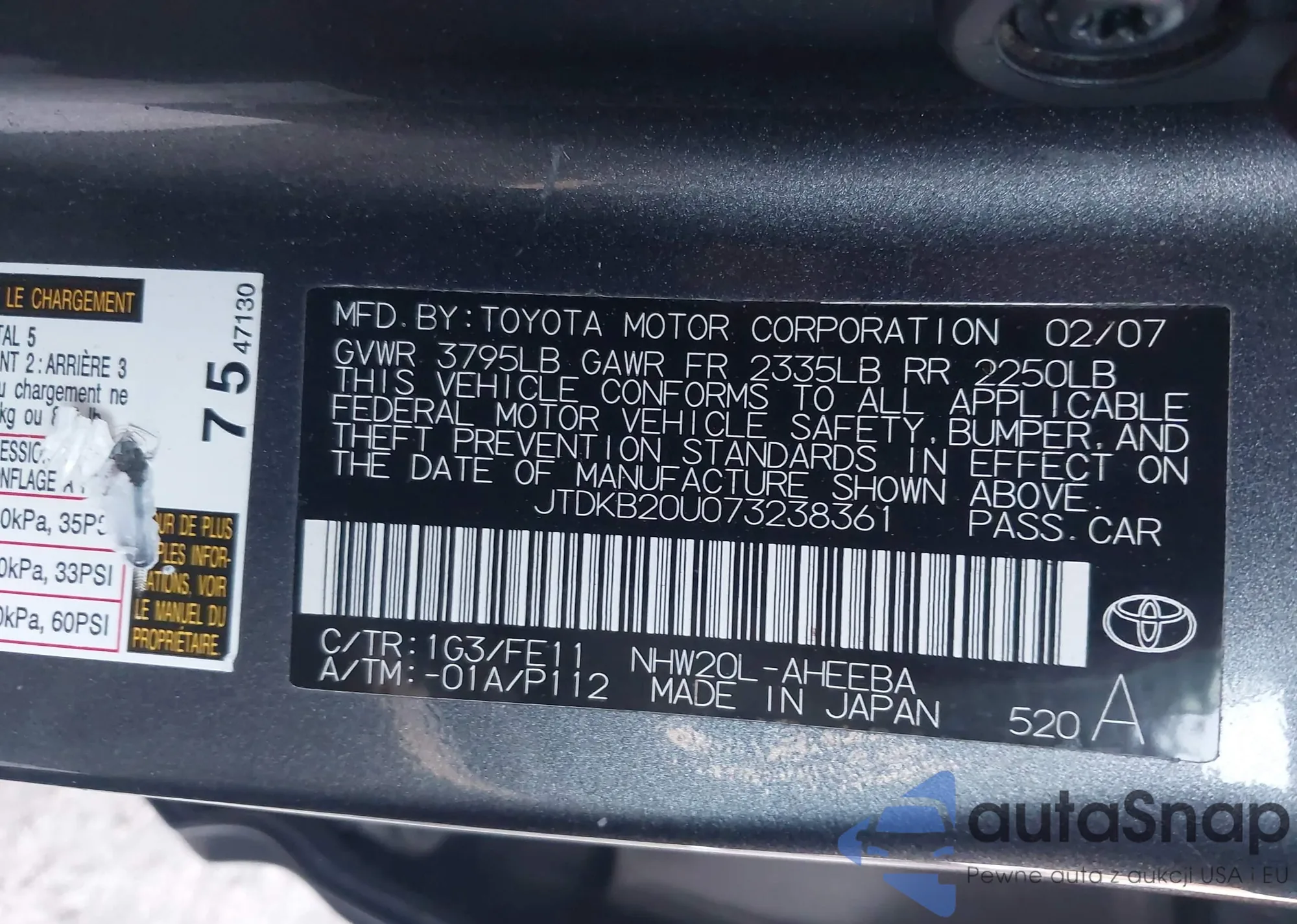 LOT: 43892908 VIN: JTDKB20U073238361