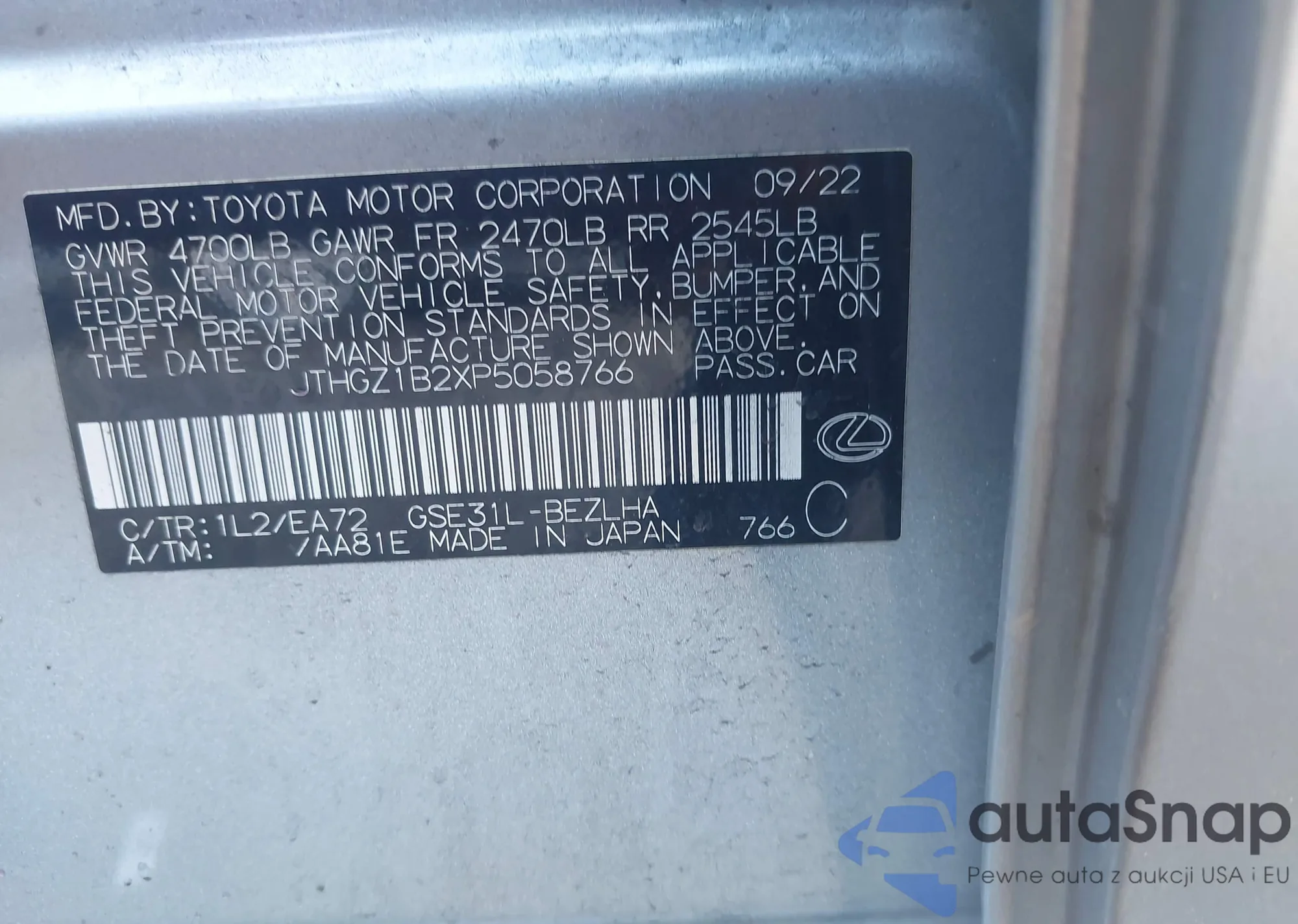 • VIN JTHGZ1B2XP5058766