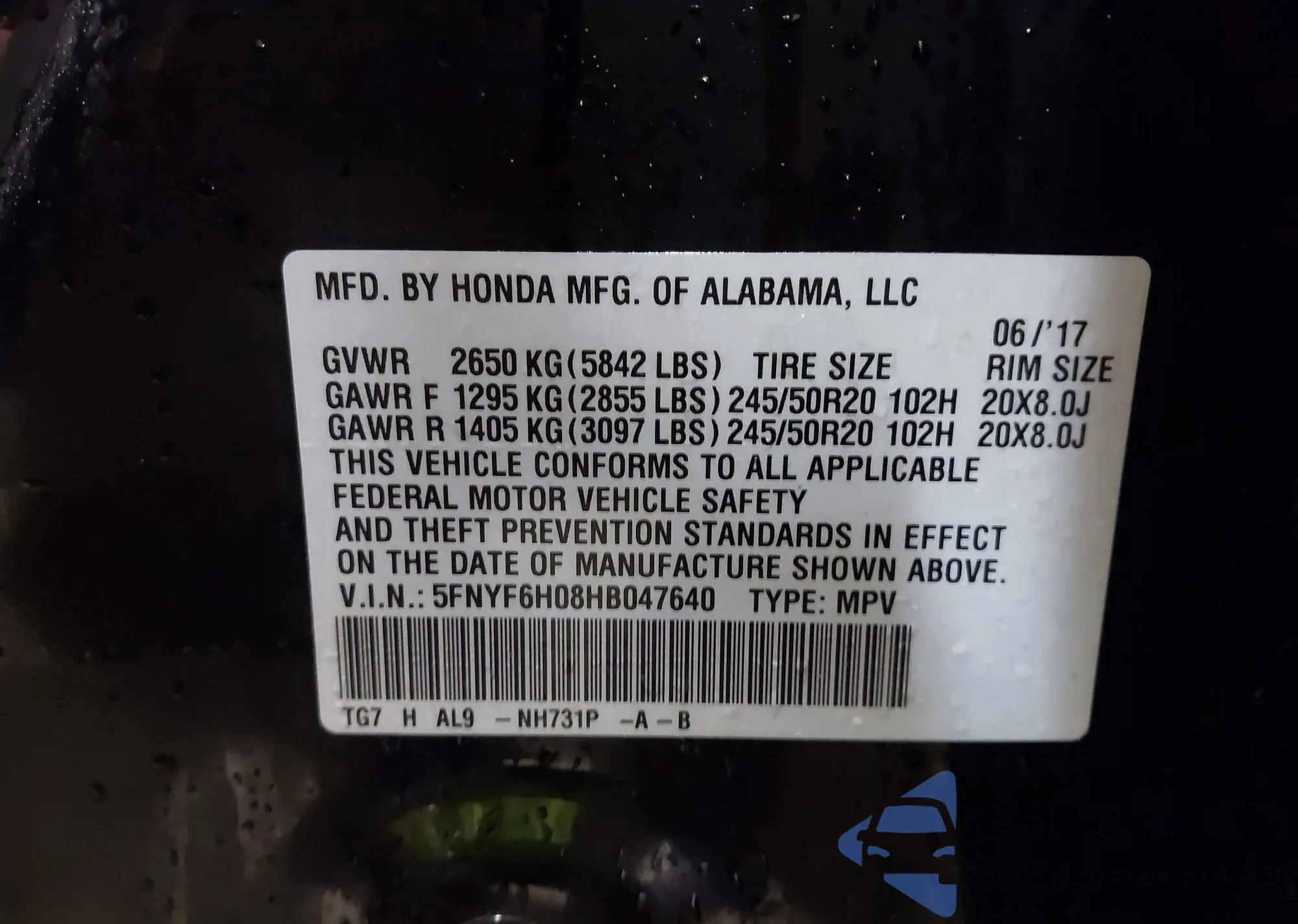 • VIN 5FNYF6H05KB042998