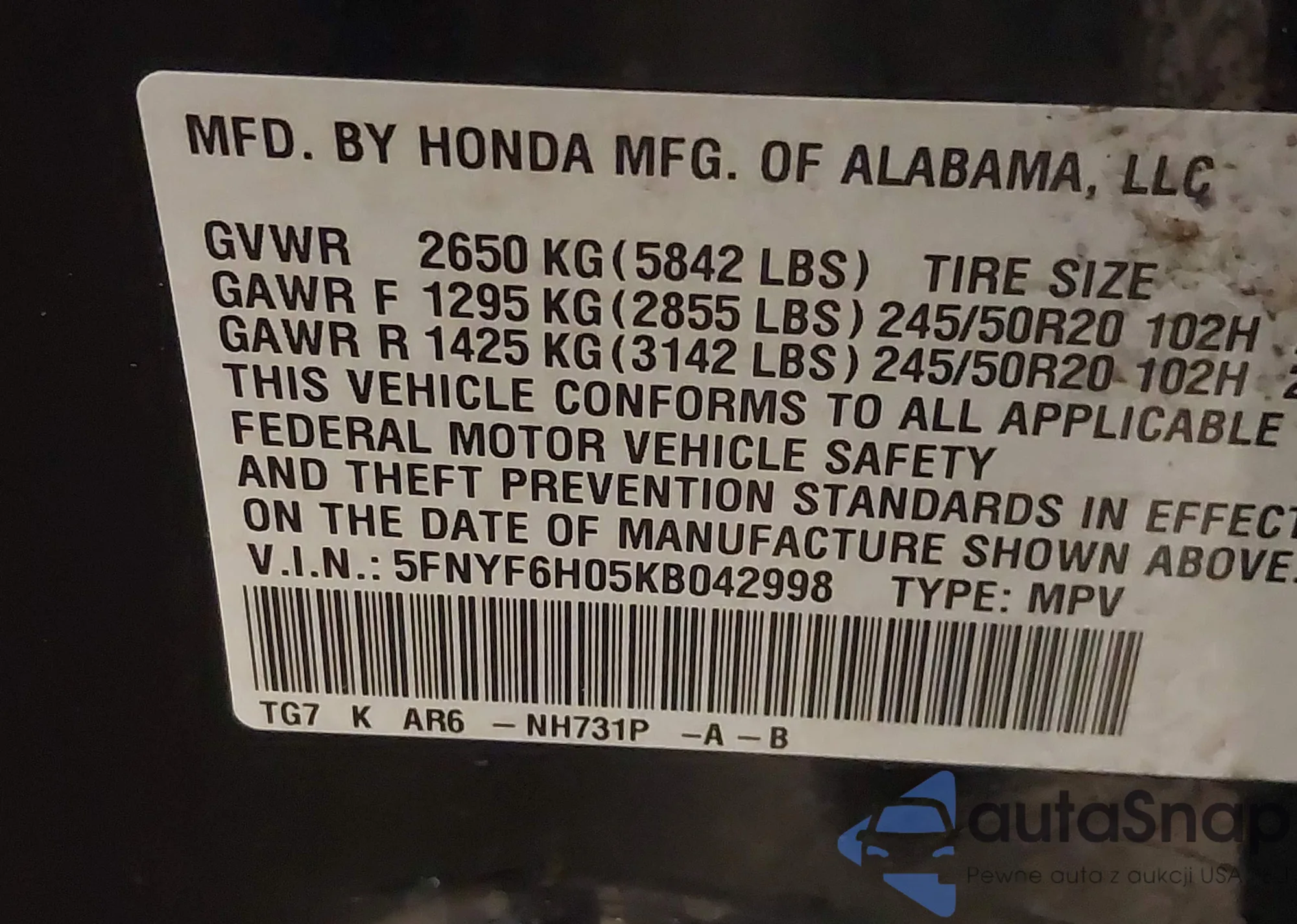 LOT: 43885250 VIN: 5FNYF6H05KB042998