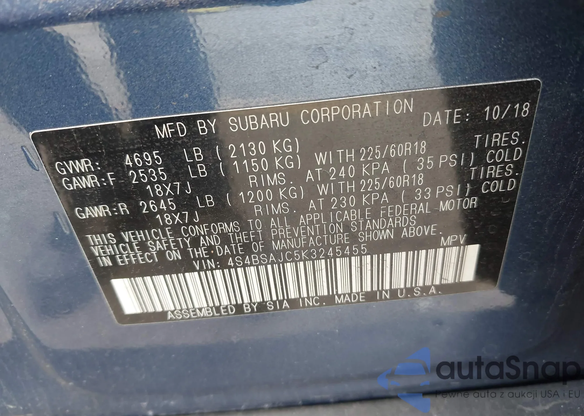 • VIN 4S4BSAJC5K3245455