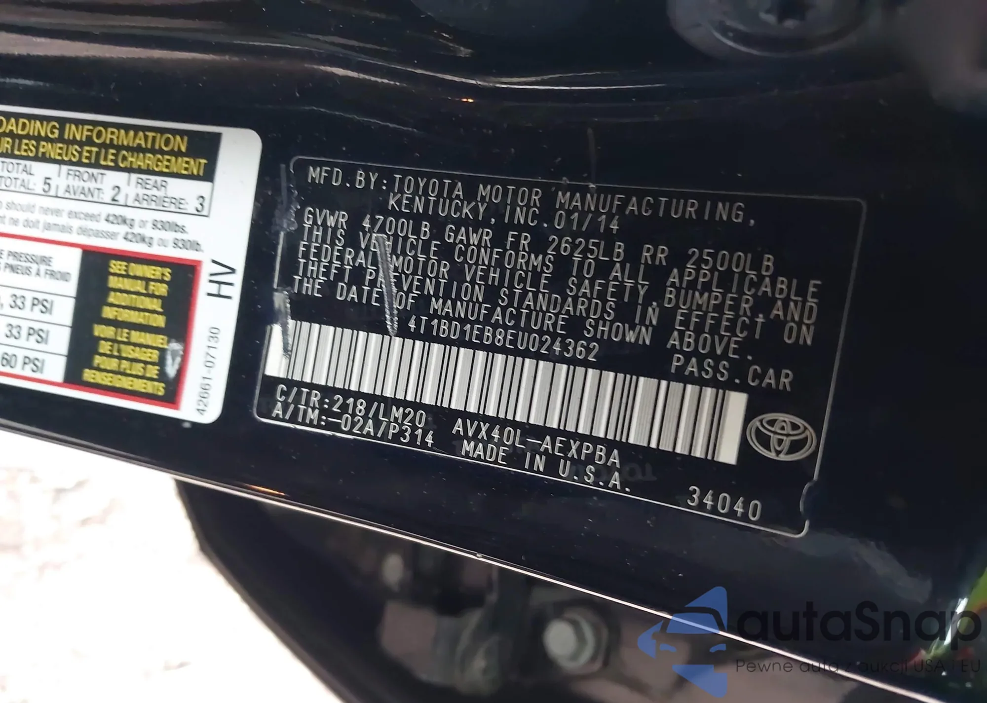 LOT: 44146162 VIN: 4T1BD1EB8EU024362