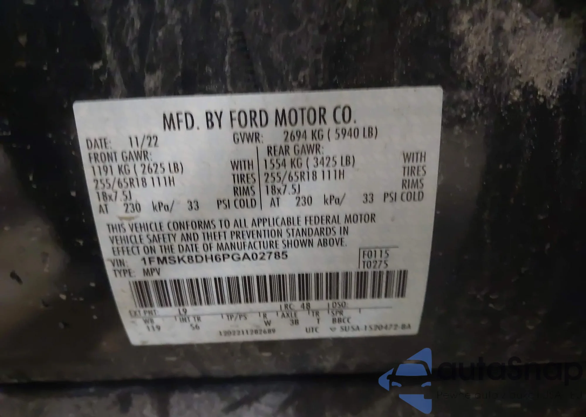 LOT: 43867233 VIN: 1FMSK8DH6PGA02785