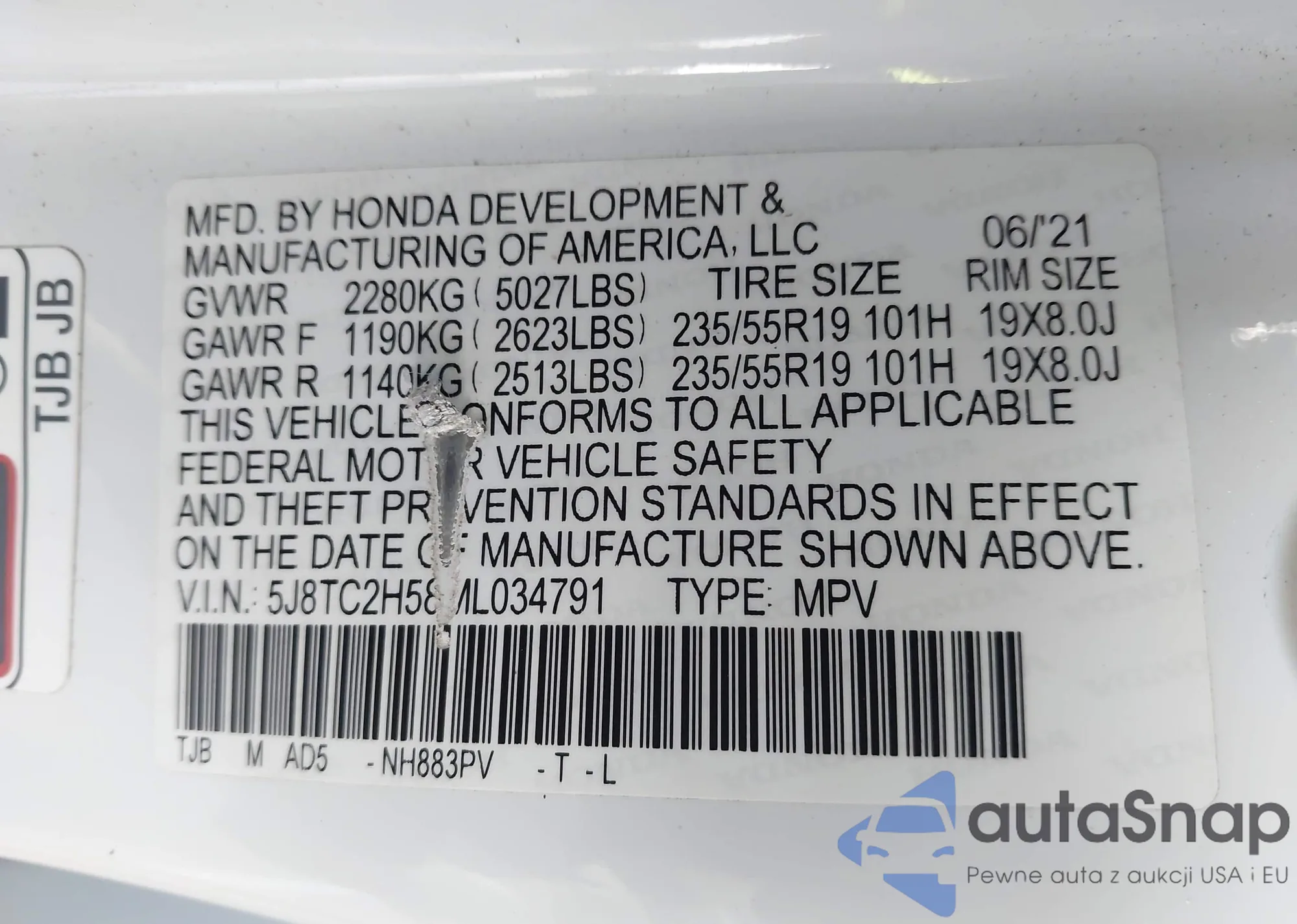 LOT: 43829571 VIN: 5J8TC2H58ML034791