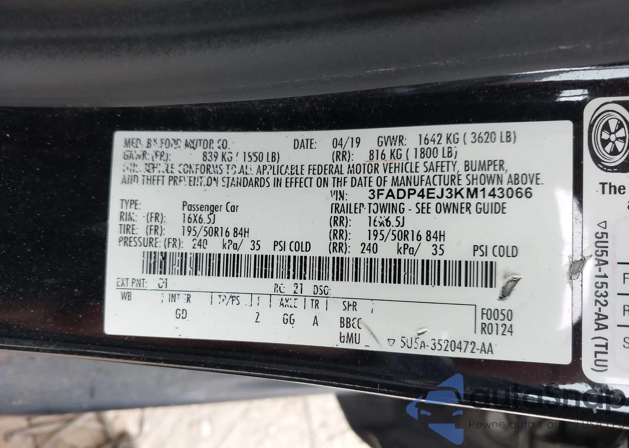 LOT: 43809226 VIN: 3FADP4EJ3KM143066
