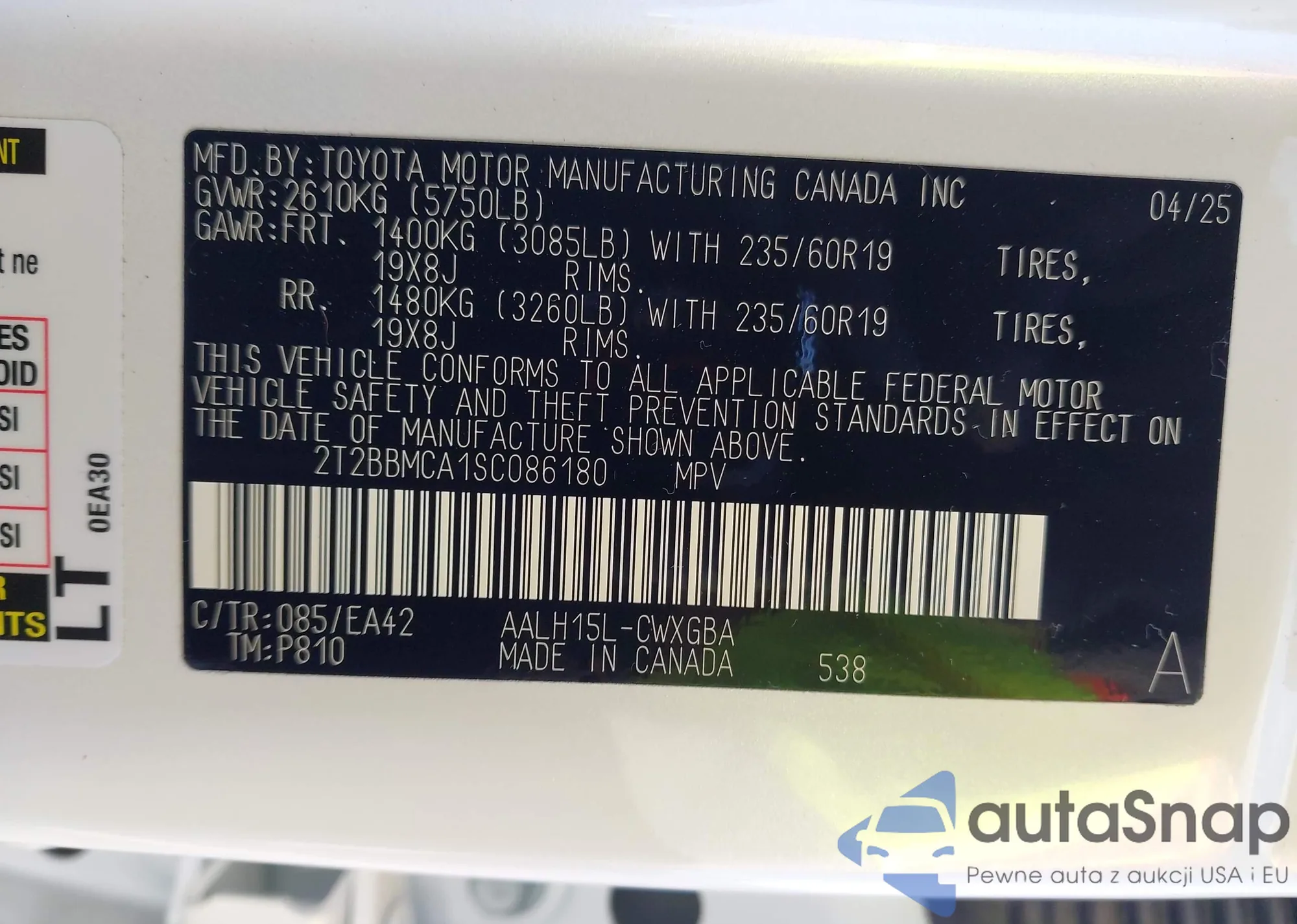 • VIN 2T2BBMCA1SC086180