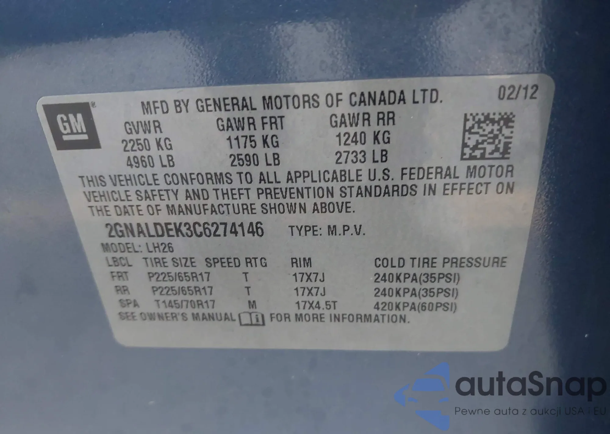 • VIN 2GNALDEK3C6274146