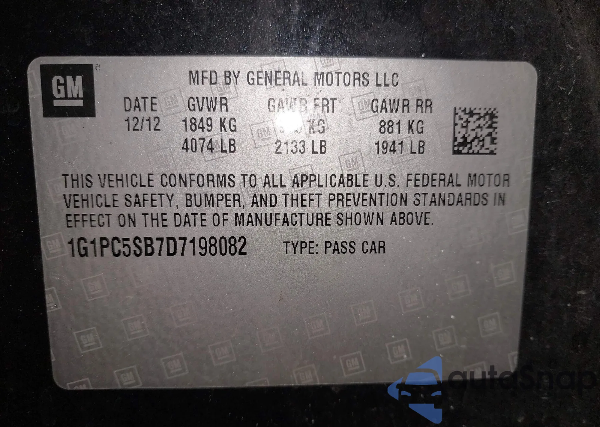 LOT: 43984371 VIN: 1G1PC5SB7D7198082
