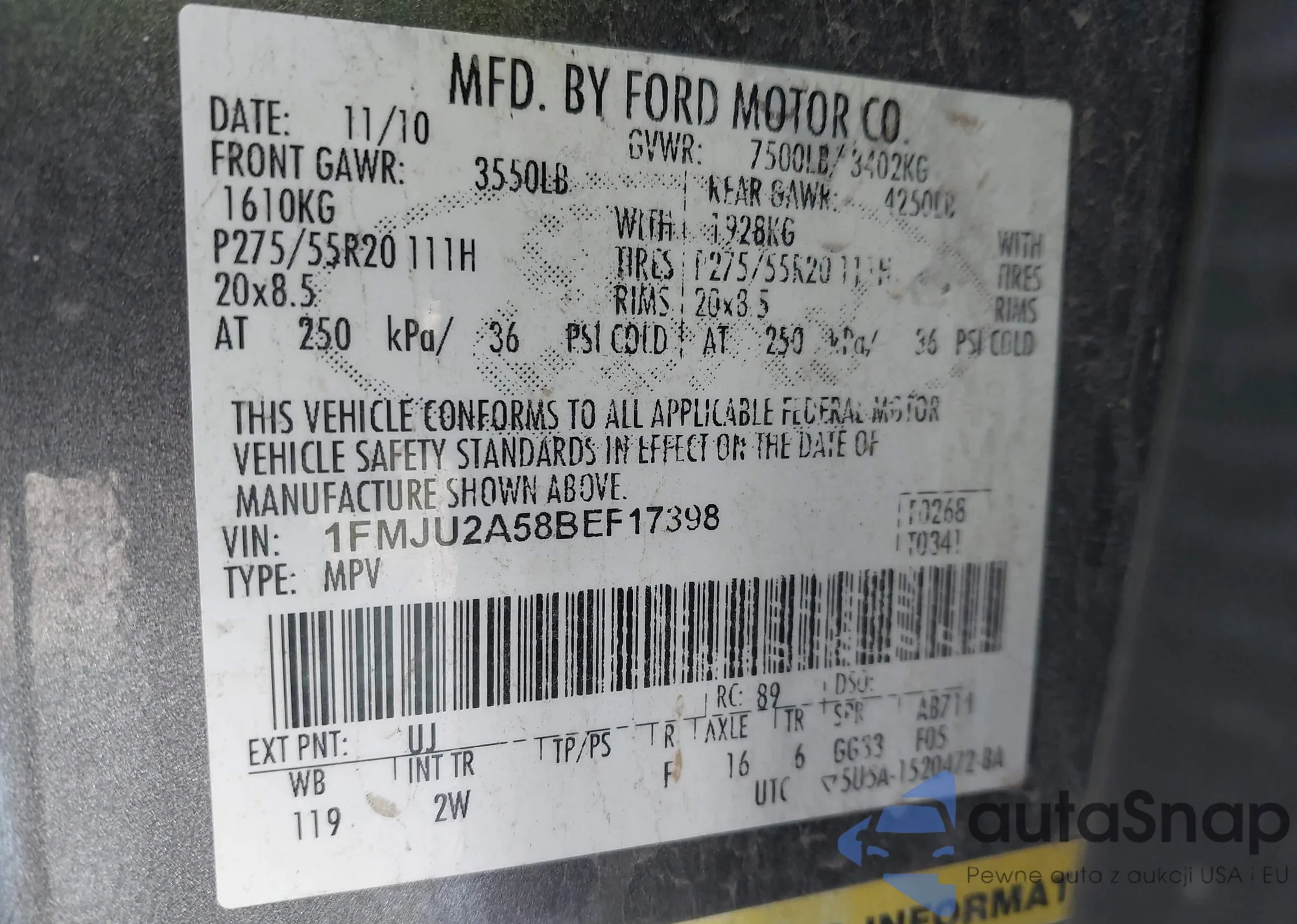 LOT: 44056276 VIN: 1FMJU2A58BEF17398