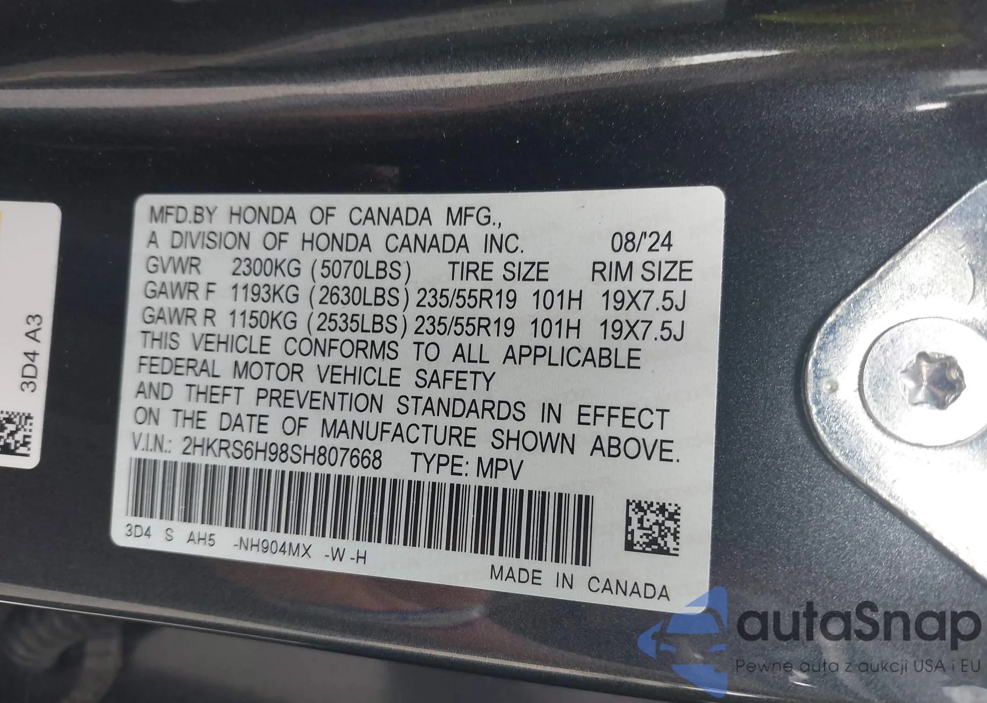 • VIN 2HKRS6H98SH807668