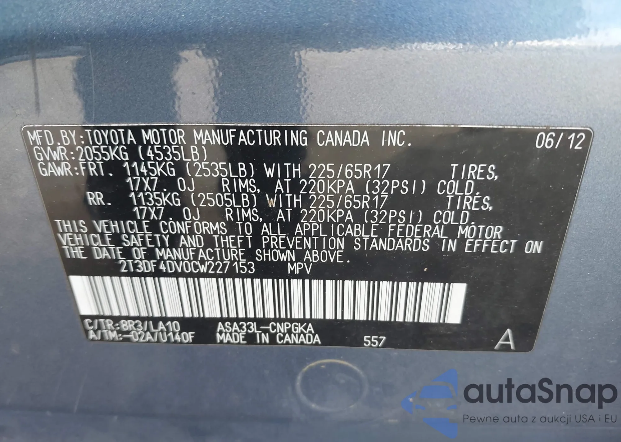 • VIN 2T3DF4DV0CW227153