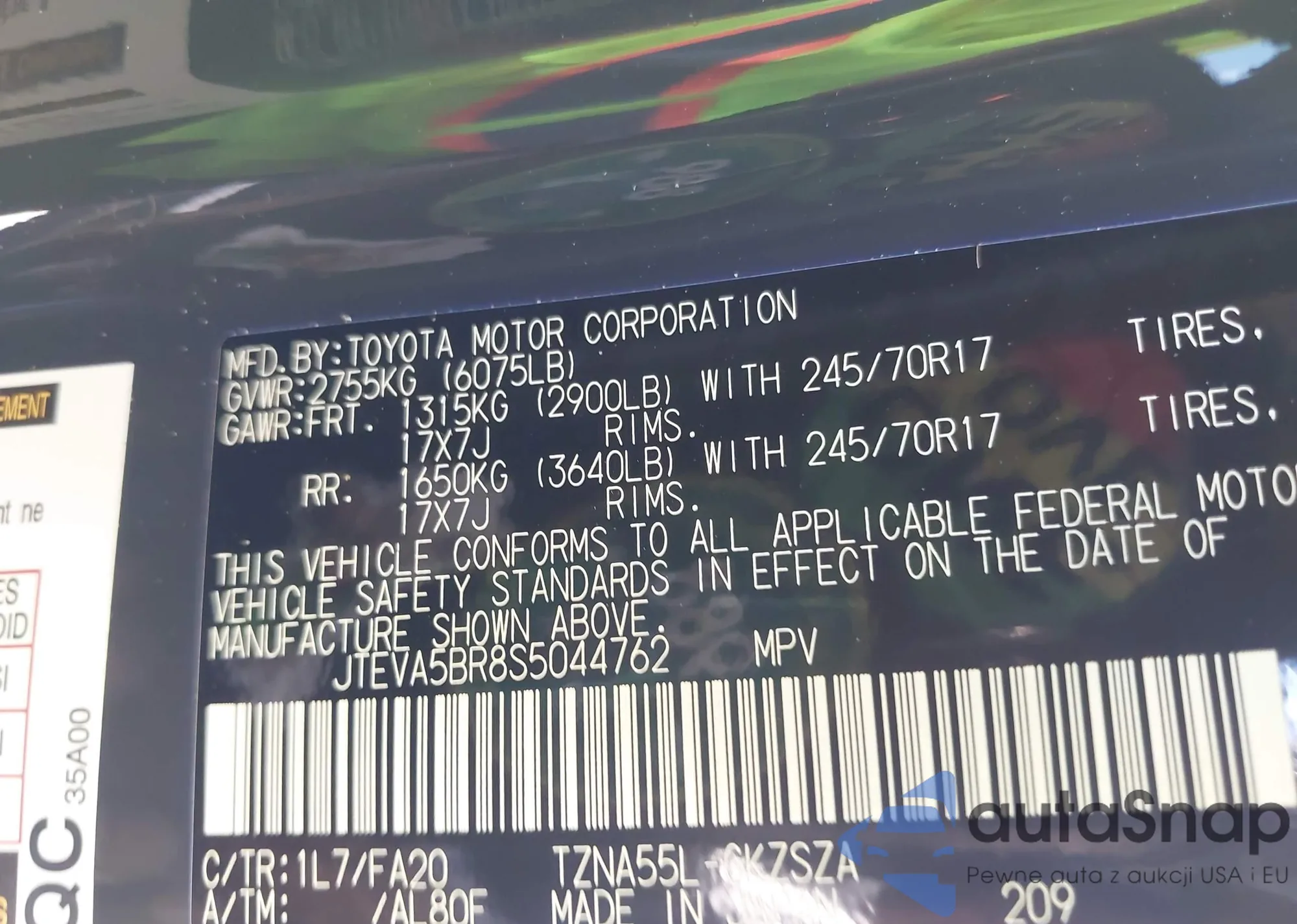 LOT: 43544870 VIN: 2T3H1RFV1SW398955