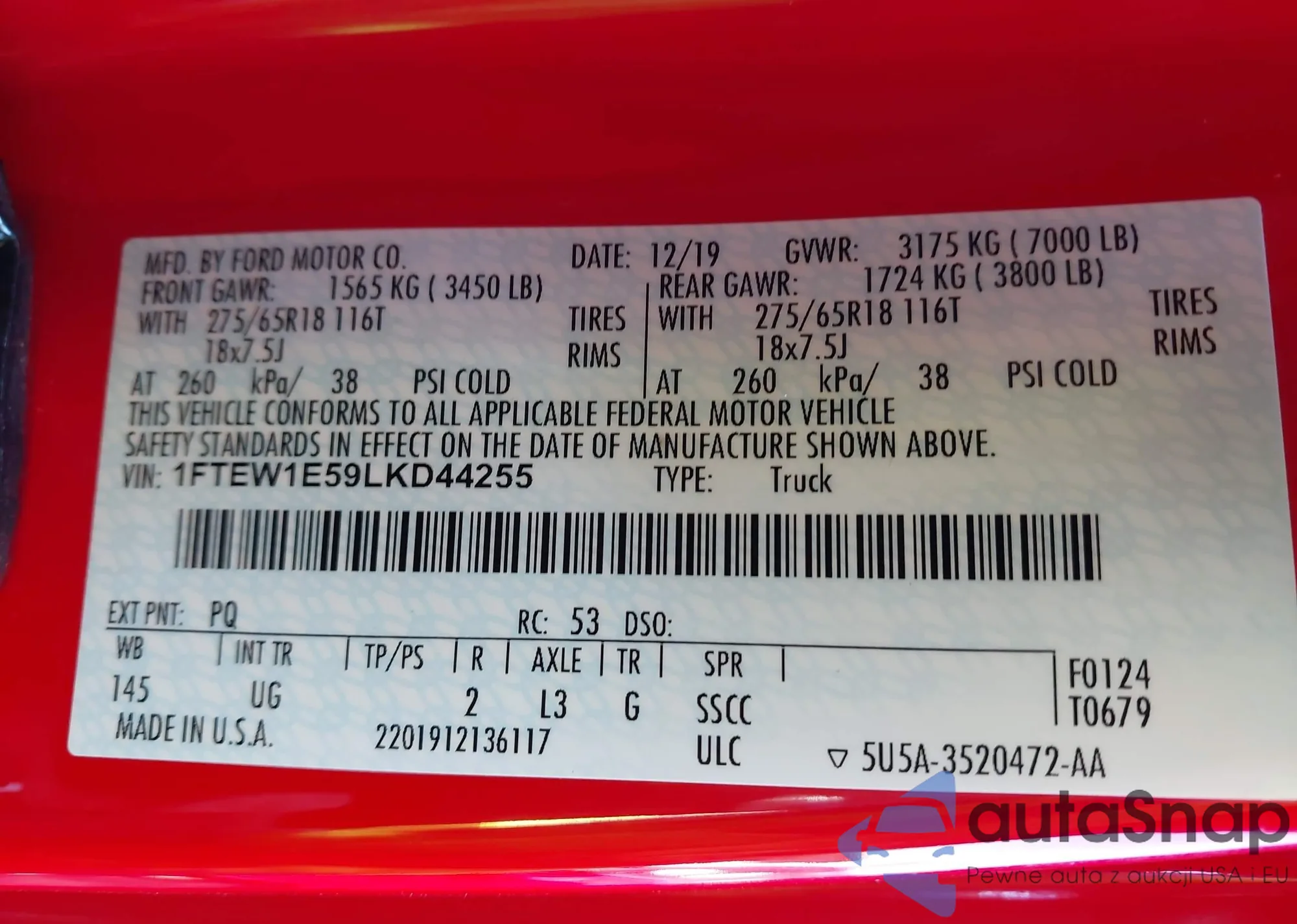 LOT: 43595795 VIN: 1FTEW1E59LKD44255