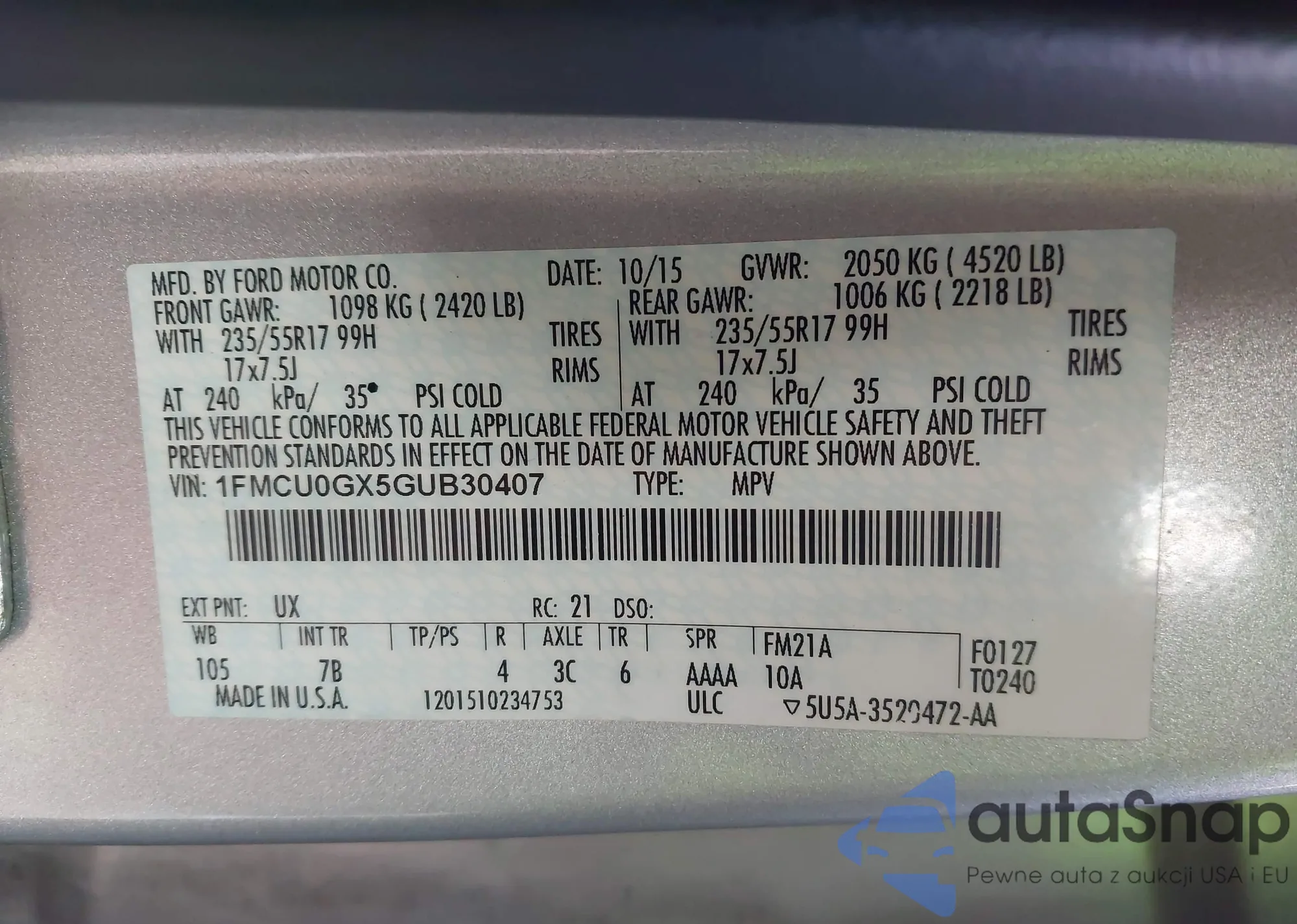 • VIN 1FMCU0GX5GUB30407