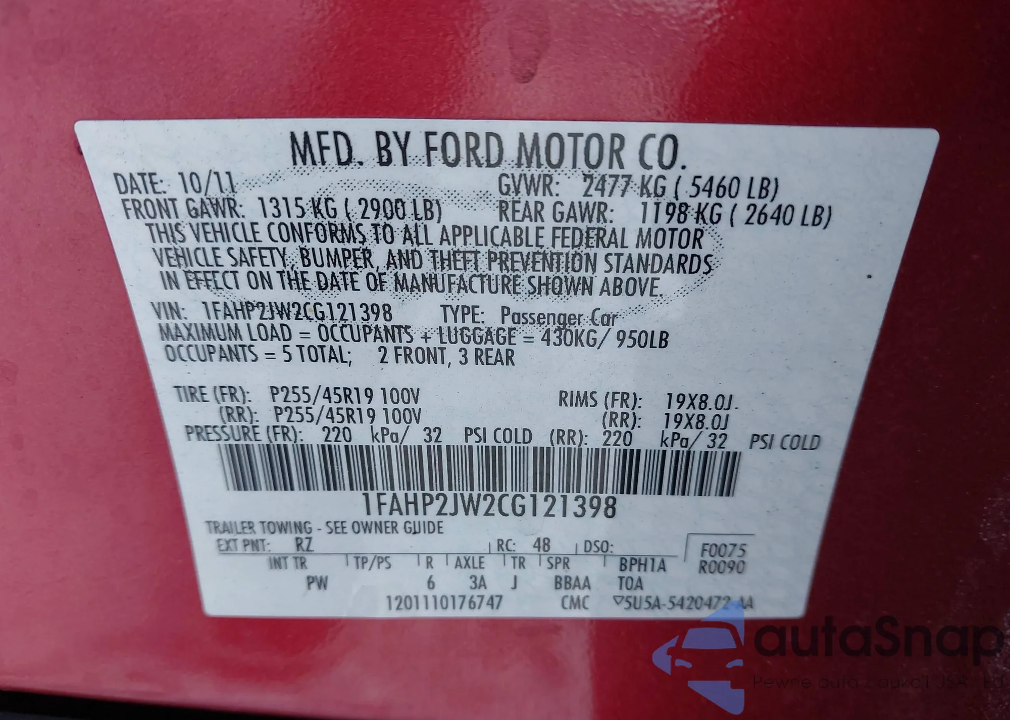 • VIN 1FAHP2JW2CG121398