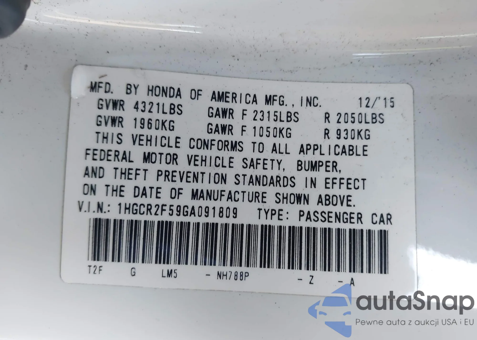 LOT: 43762535 VIN: 1HGCR2F59GA091809