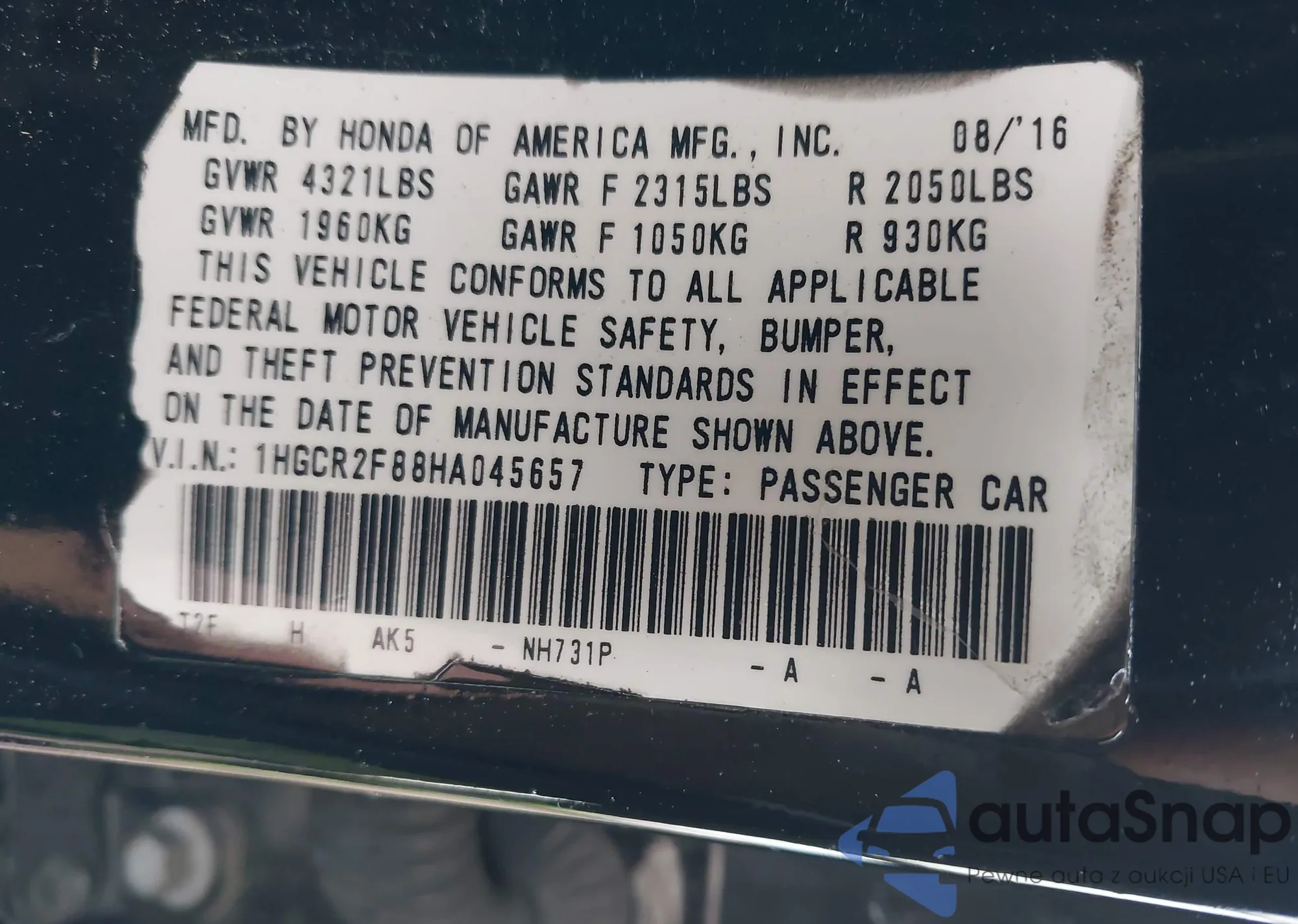 LOT: 43918359 VIN: 1HGCR2F88HA045657