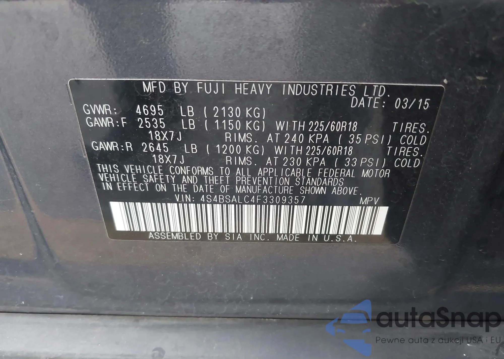 LOT: 43965669 VIN: 4S4BSALC4F3309357
