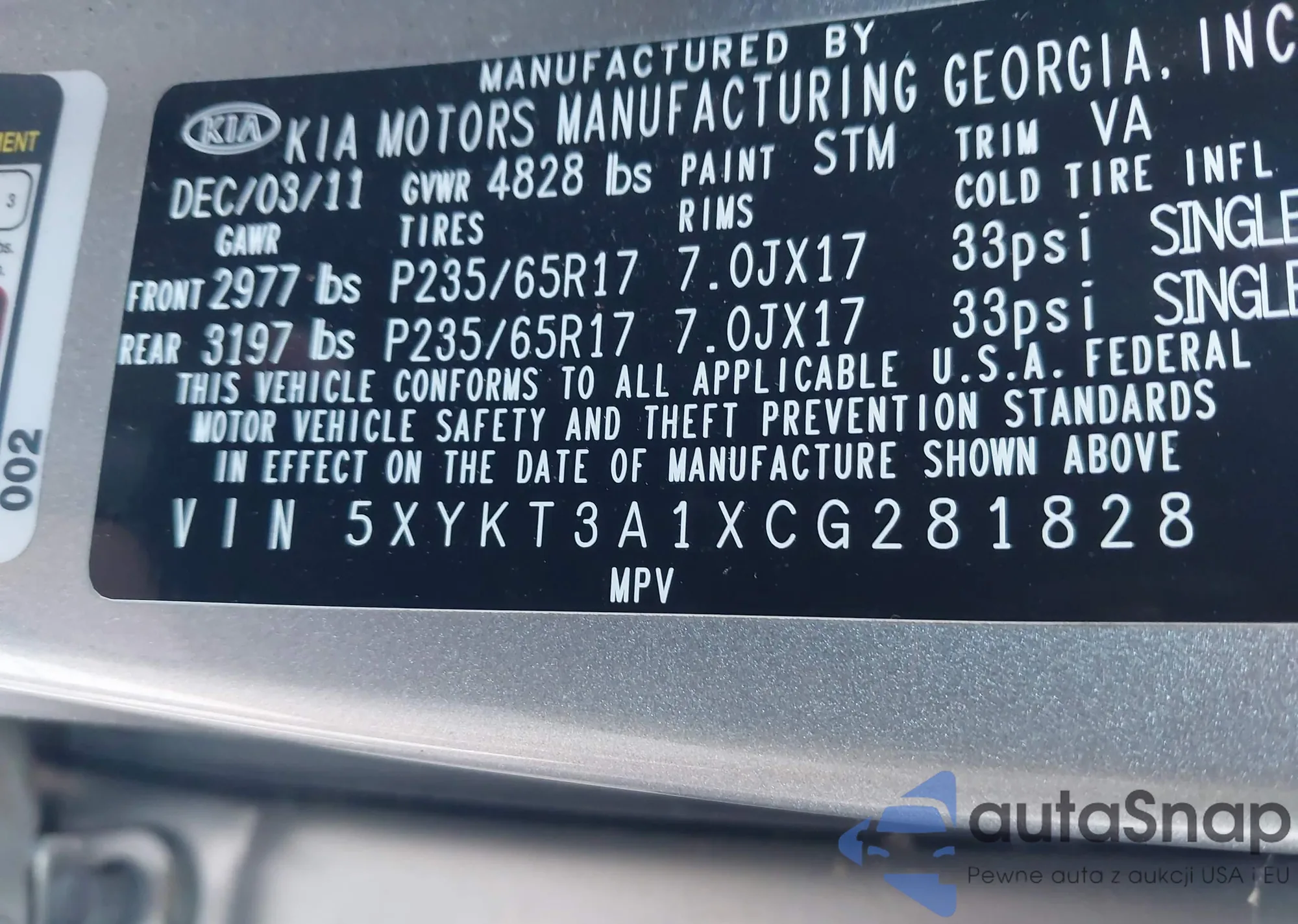 • VIN 5XYKT3A1XCG281828