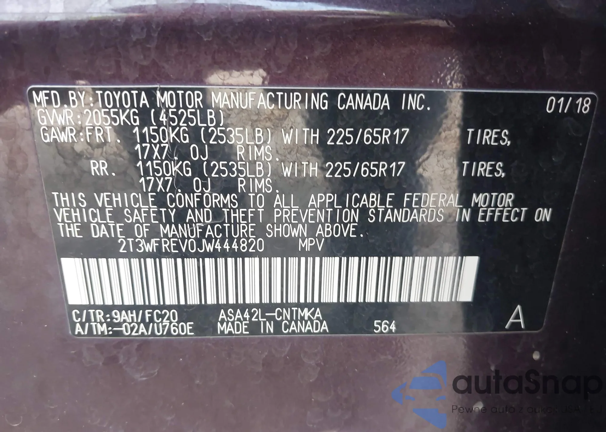 LOT: 44014747 VIN: 2T3WFREV0JW444820