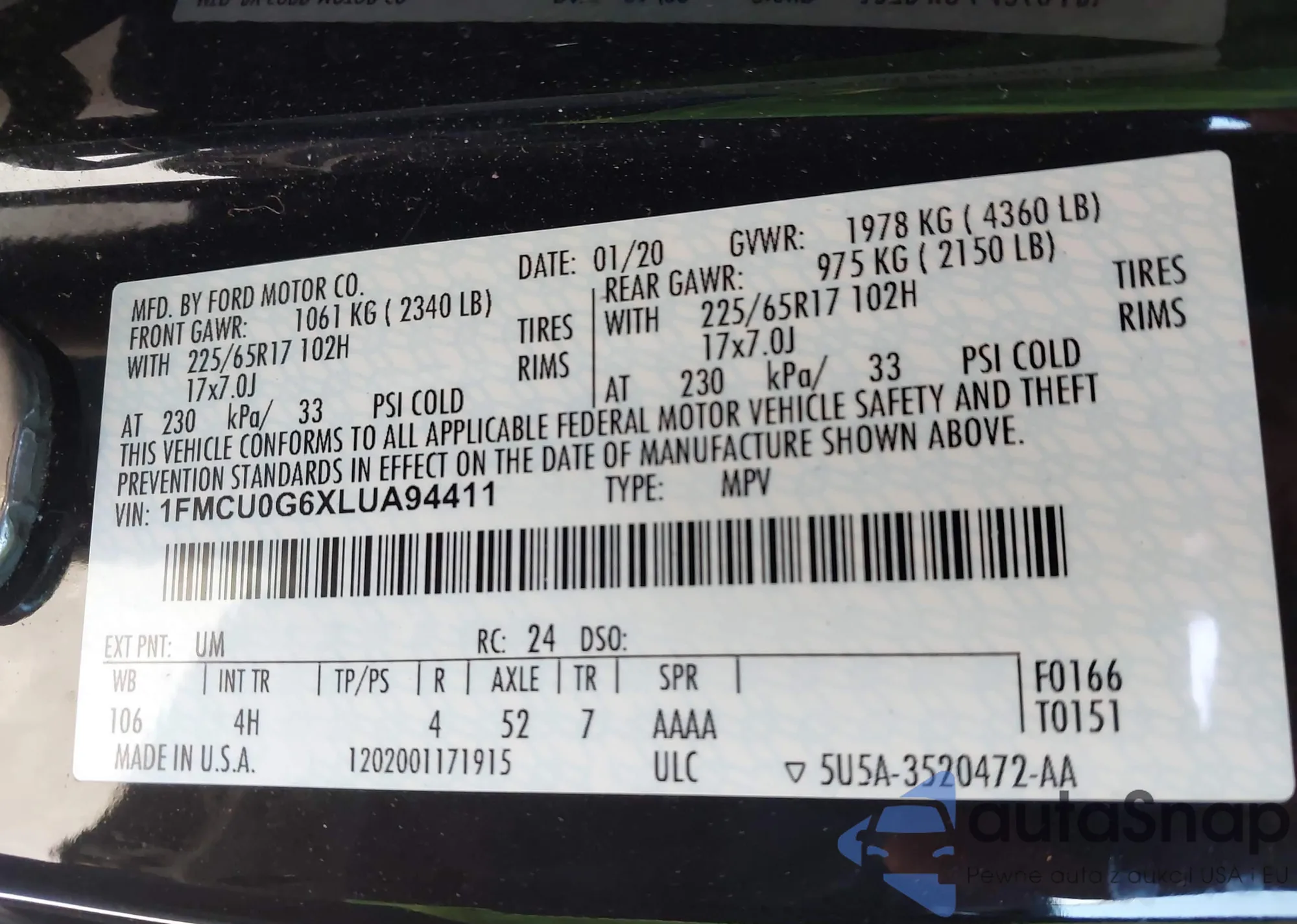 • VIN 1FMCU0G6XLUA94411