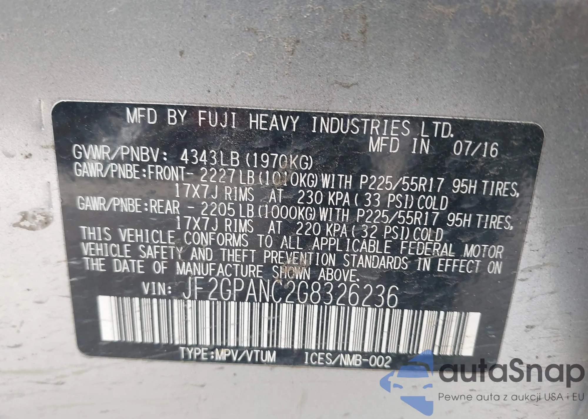 LOT: 43719037 VIN: JF2GPANC2G8326236