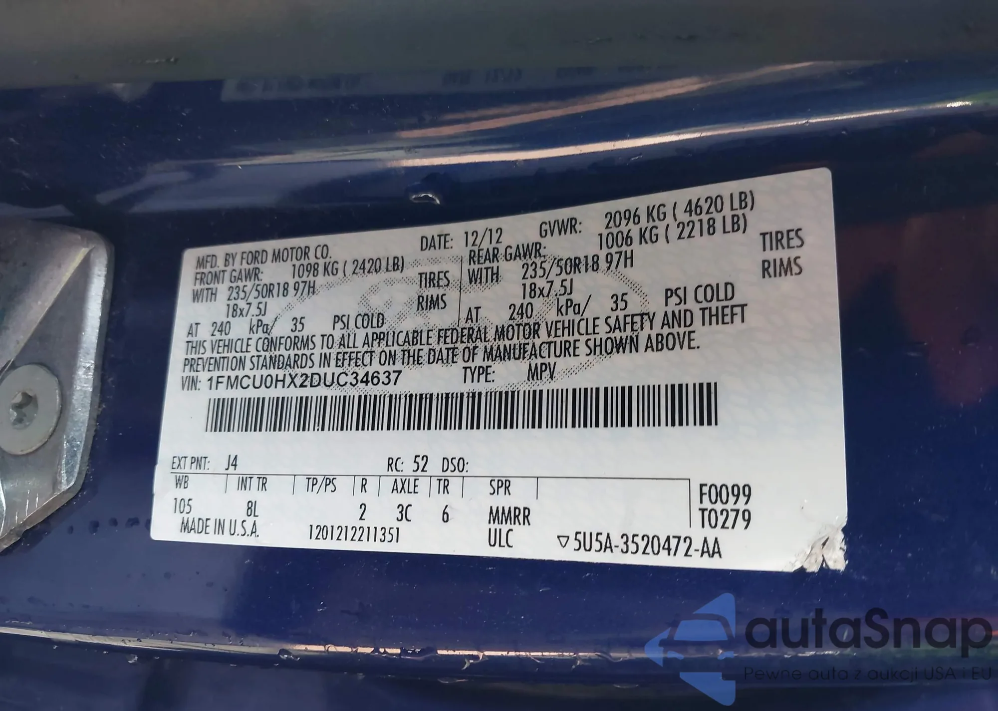 • VIN 1FMCU0HX2DUC34637