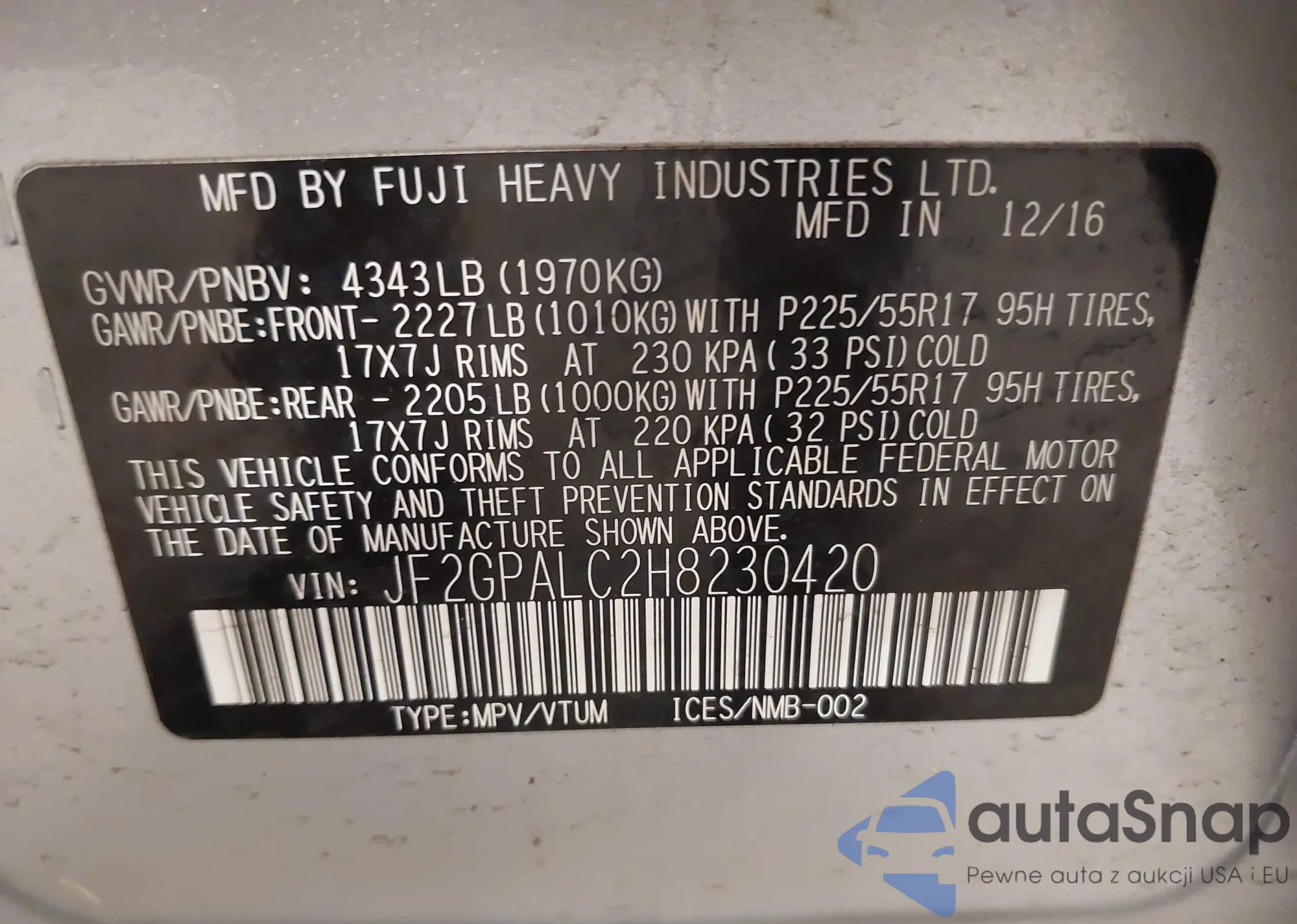 • VIN JF2GPALC2H8230420