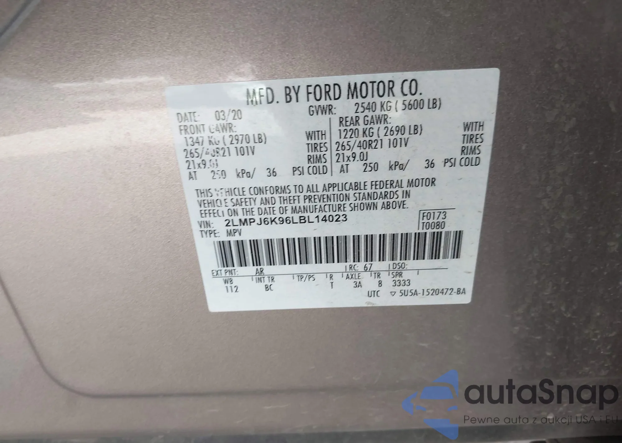 LOT: 43708714 VIN: 2LMPJ6K96LBL14023