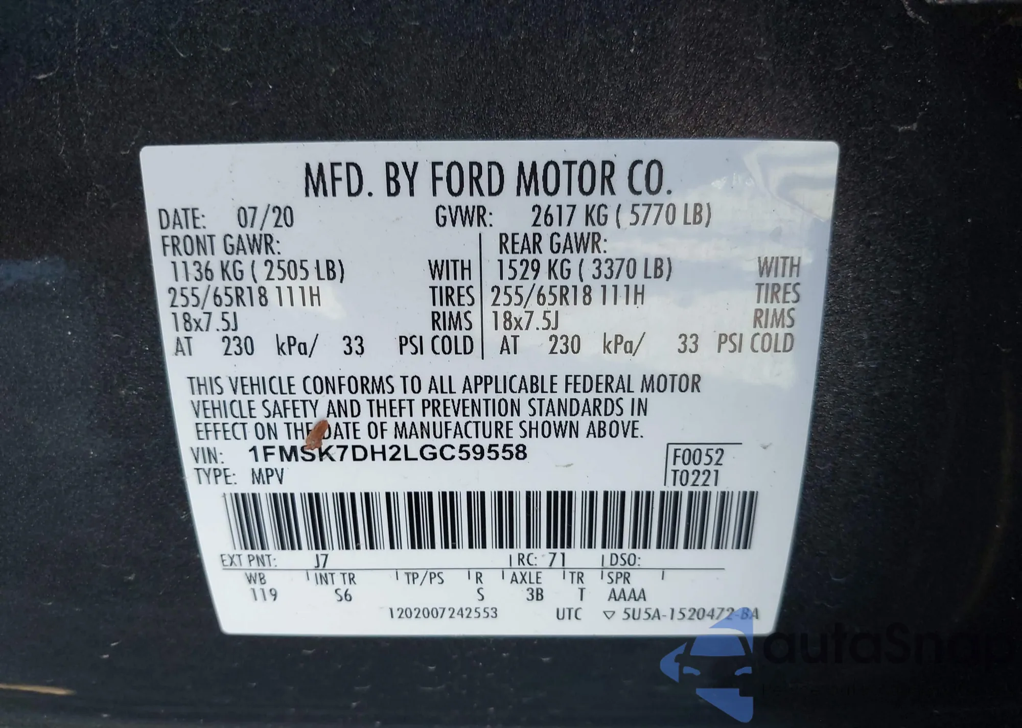 LOT: 44108117 VIN: JM3KFACM5L0808870
