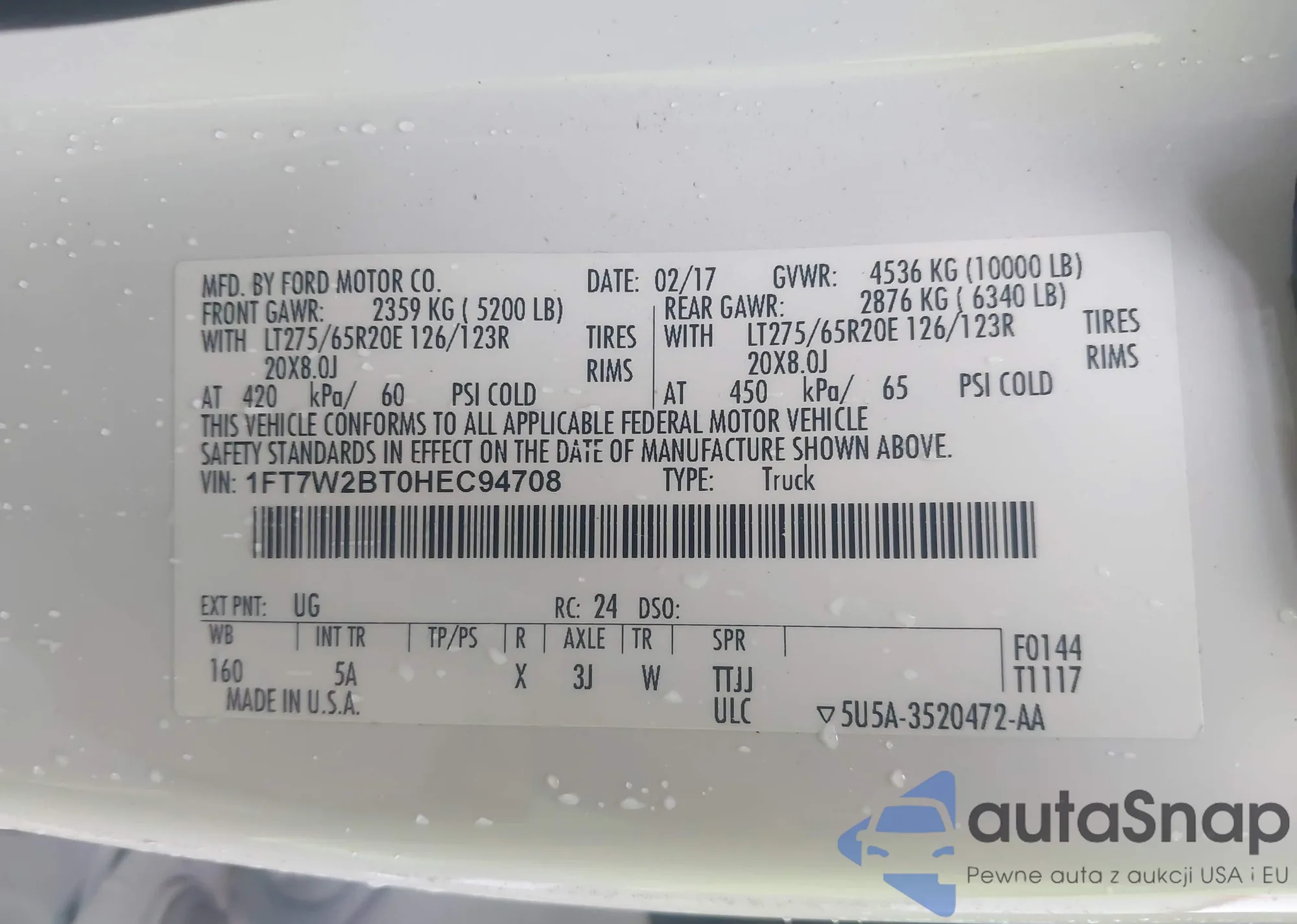LOT: 43844995 VIN: 1FT7W2BT0HEC94708