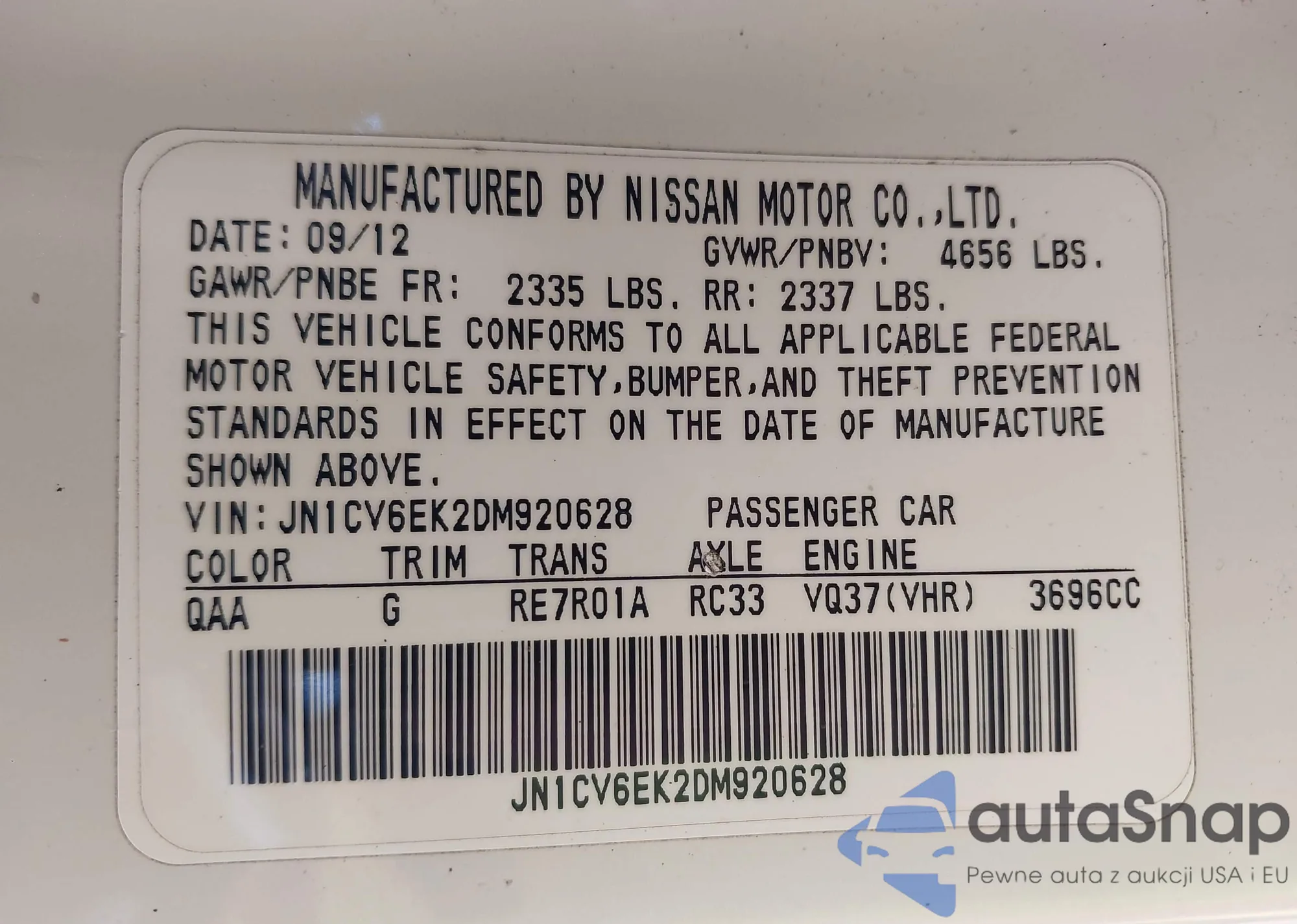 LOT: 43864300 VIN: JN1CV6EK2DM920628