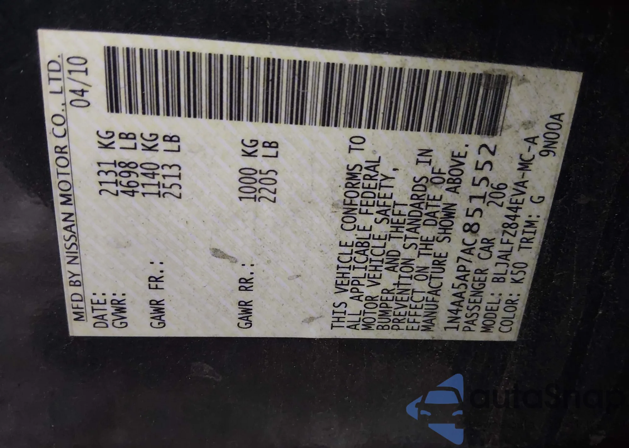 • VIN WBAJB9C51KB465157