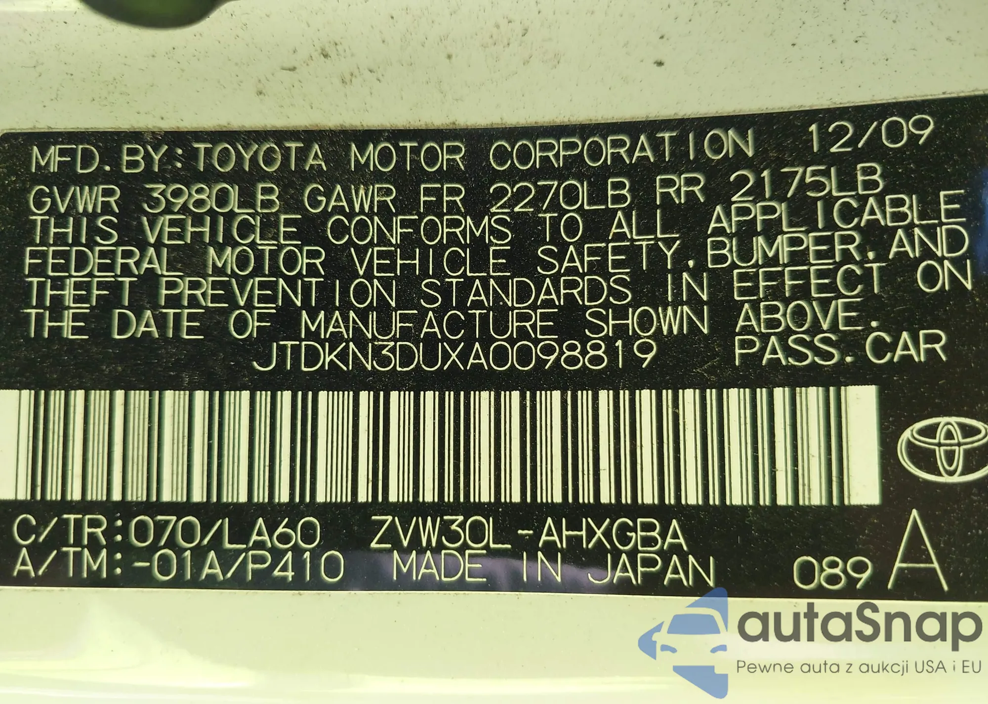 • VIN JTDKN3DUXA0098819