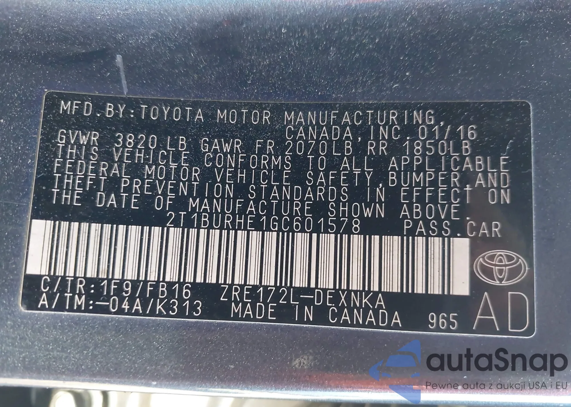 • VIN 2T1BURHE1GC601578